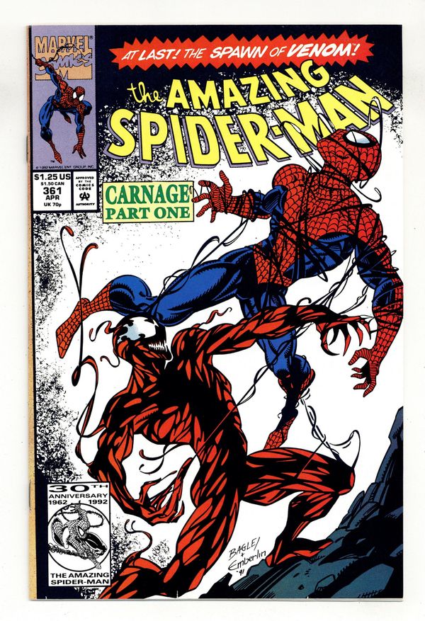 First Printing. Direct Edition. First (full) appearance of Carnage in "Savage Genesis!" Part 1 of 3. Script by David Michelinie. Pencils by Mark Bagley. Inks by Randy Emberlin. Cover by Mark Bagley and Randy Emberlin. Blood runs in the streets as a serial killer roams New York City! And as the web-slinger investigates the murders, he notices a very disturbing similarity to another killer's modus operandi! In a burned-out building in Brooklyn, the spectacular one comes face-to-face with his new homicidal foe...Carnage! Can the wall-crawler end Cletus Kasady's rampage in their very first encounter? Cameo appearances by Aunt May and Mary Jane Watson. Flashback cameo by Venom. (Note: This three-part story was reprinted in 2011 in the trade paperback: Spider-Man -- The Vengeance of Venom.) 36 pages, full color. $1.25 cover price. NOTE: Most of these were distributed with slight printer tears in the bottom edge of the cover. Cover price $1.25. Grade: VF/NM 9.0 explanation of grade Condition: Used (collectible)