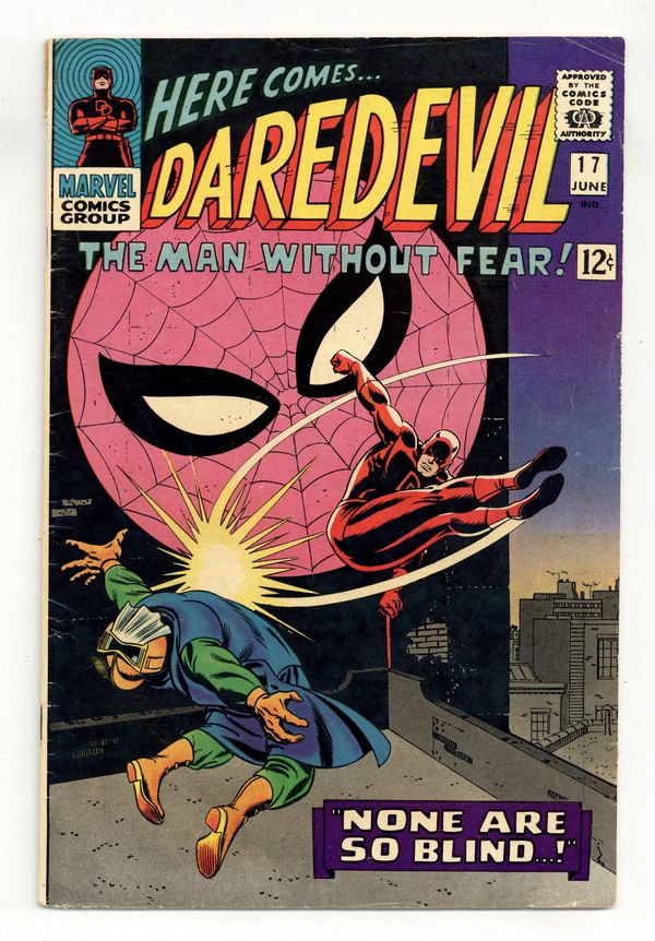 Cover pencils by John Romita, inks by Frank Giacoia. Spider-Man guest stars in None Are So Blind!, script by Stan Lee, pencils by John Romita Sr., inks by Frank Giacoia (as "Frank Ray"); Spidey, thinking he has discovered Daredevil's secret, accuses Foggy of being DD; Foggy kind of plays along to impress Karen; DD and Spidey stop fighting long enough to take down the Masked Marauder. 36 pgs. Cover price $0.12. Cover price $0.12. Grade: VG- 3.5 explanation of grade Condition: Used (collectible)