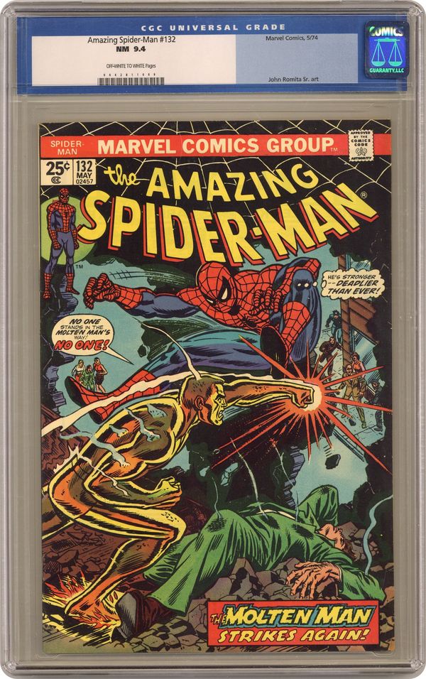 Cover by Gil Kane and John Romita Sr. The Master Plan of the Molten Man!, script by Gerry Conway, pencils by John Romita Sr., Paul Reinman, and Tony Mortellaro, inks by Paul Reinman and Tony Mortellaro; Trouble arises for both Peter Parker and Ned Leeds, as the Molten Man continues his reign of terror!; With Molten Mans powers strengthened, will Spider-Man be able to overcome one of his greatest opponents yet?; Plus, Ned finds himself in grave danger after being exposed to heavy radiation. Ad for bronze collectors' medallion coins with Spider-Man, Hulk, and Conan images. Marvel Value Stamp #6 featuring Thor. Deadly Hands of Kung Fu ad. Reprinted in Marvel Tales # 109. 36 pgs., full color. $0.25. Cover price $0.25. Grade: CGC 9.4 explanation of grade Condition: Used (collectible)