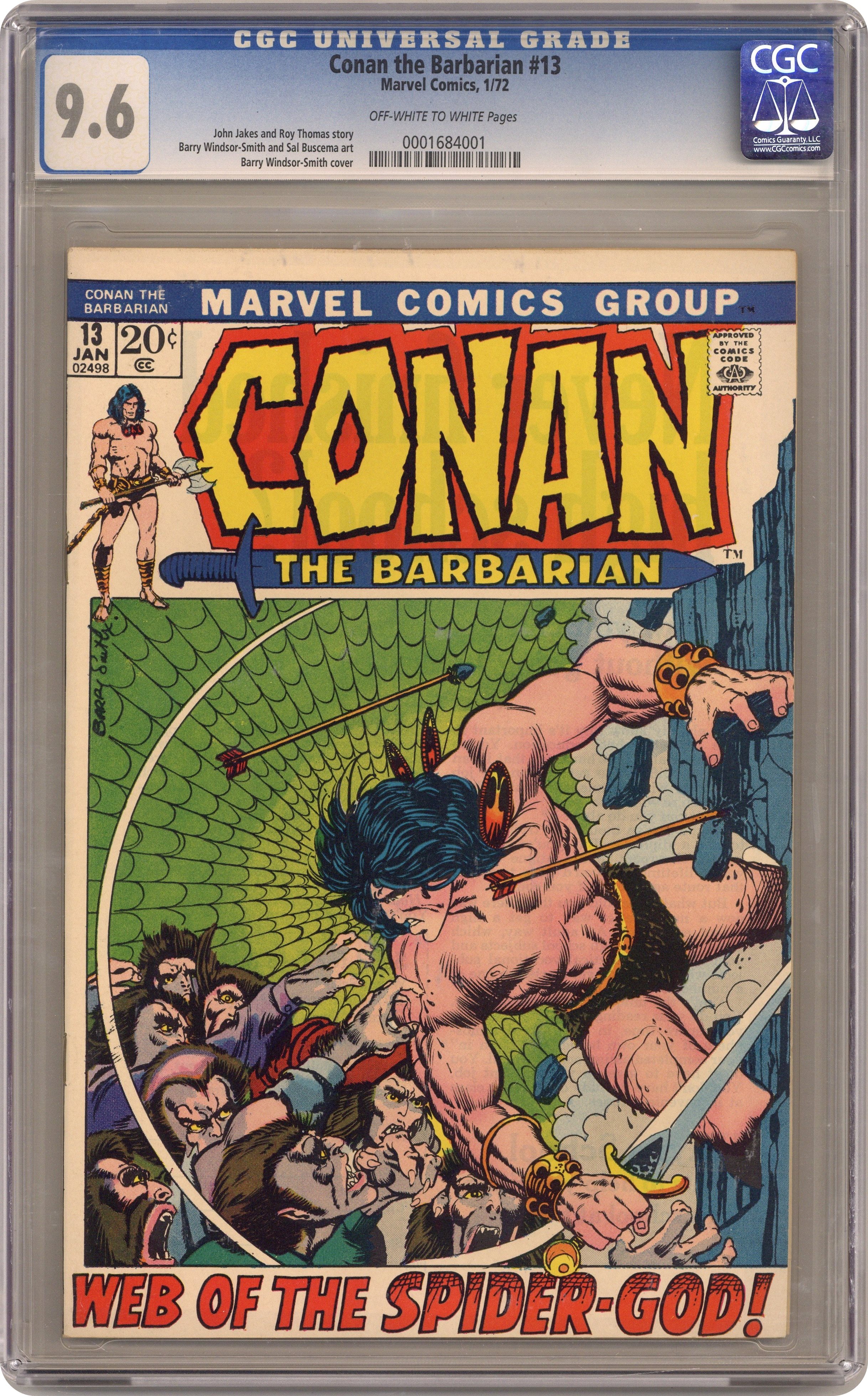 Cover art by Barry Windsor-Smith. Web of the Spider-God, plot by John Jakes, script by Roy Thomas, pencils by Barry Windsor-Smith, inks by Sal Buscema; setting: desert east of Ophir & city of Yezud; Conan is delirous in desert, Thanix saves his life; Conan fights Omm (giant spider), Tork destroys Yezud and leaves for Shadizar with Lea. 36 pgs. Cover price: $0.20. Cover price $0.20. Grade: CGC 9.6 explanation of grade Condition: Used (collectible)
