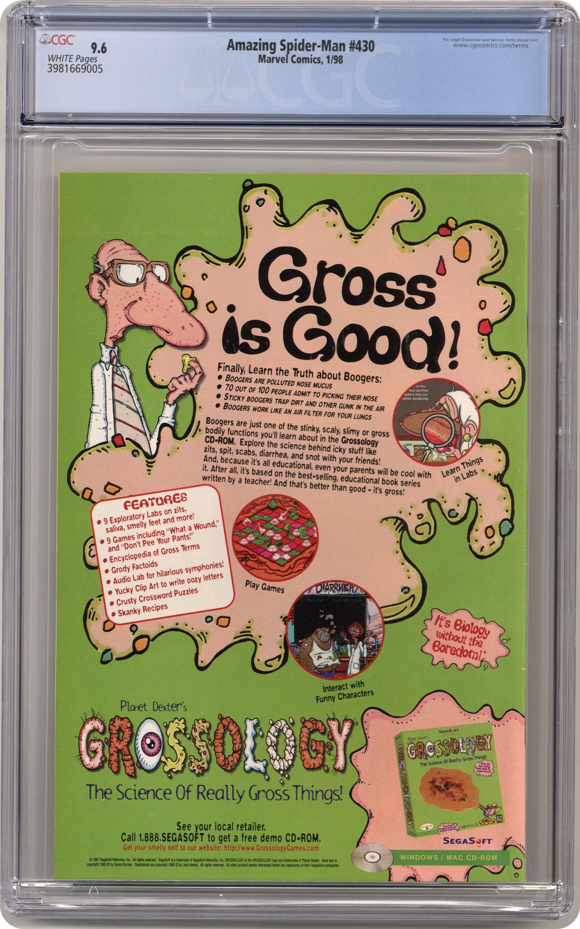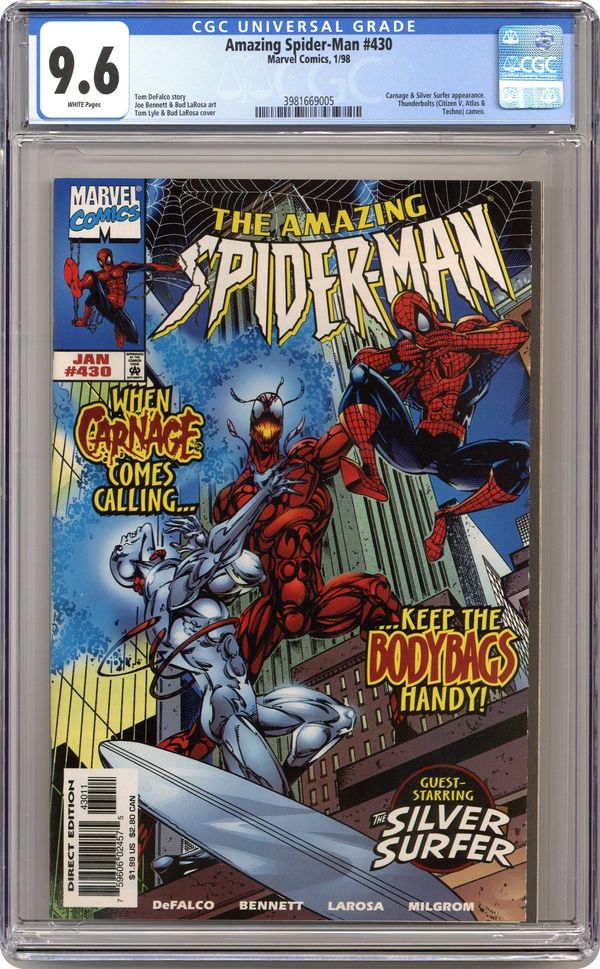Direct Edition. Cover pencils by Tom Lyle, inks by Bud LaRosa. Carnage and the Silver Surfer guest star in "Savage Rebirth!", script by Tom DeFalco, pencils by Joe Bennett, inks by Bud LaRosa; Spider-Man rejoices that the Avengers have been confirmed to be alive; He begins dealing with the one million dollar reward the Bugle has on him; He heads toward the Baxter Building to visit the Fantastic Four, only to remember that the Thunder Bolts recently purchased the building; Peter agrees to quit being Spider-Man, as Mary meets up with Jill; Dr. Ashley Kafka, the new director of the Ravencroft Institute wants to shut down the microwave field holding back Cletus Kasady in order to cut costs. Cameos by Captain America, Iron Man, and the Vision. 38 pgs., full color. $1.99. Cover price $1.99. Grade: CGC 9.6 explanation of grade Condition: Used (collectible)