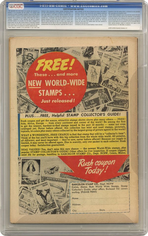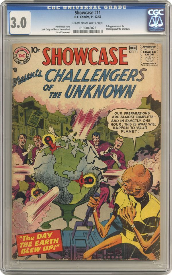 Cover art by Jack Kirby. 3rd apearance of Challengers of the Unknown in The Day the Earth Blew Up, script by Dave Wood, pencils by Jack Kirby, inks by Bruno Premiani; At the Pentagon, Navy officers and scientists are stumped; Two scientists mysteriously disappeared in Antarctica; They call in "men capable of handling the unknown," and Ace takes the call; He, Rocky, and Red fly; They'll pick up Prof along the way; Off New Guinea, Prof is astounded to find a volcano rising from the sea bed; In the Antarctic, the Challengers snow-tractor toward the mystery spot; The tractor bogs in a snowstorm and needs repairs; Ace and Rocky explore and fall through thin ice!; They land on a futuristic bridge; Above, Prof and Red are captured by skinny orange aliens in bubble-suits. Just Imagine story, art by Virgil Finlay. 36 Pages, Full Color. Cover price $0.10. Grade: CGC 3.0 explanation of grade Condition: Used (collectible)