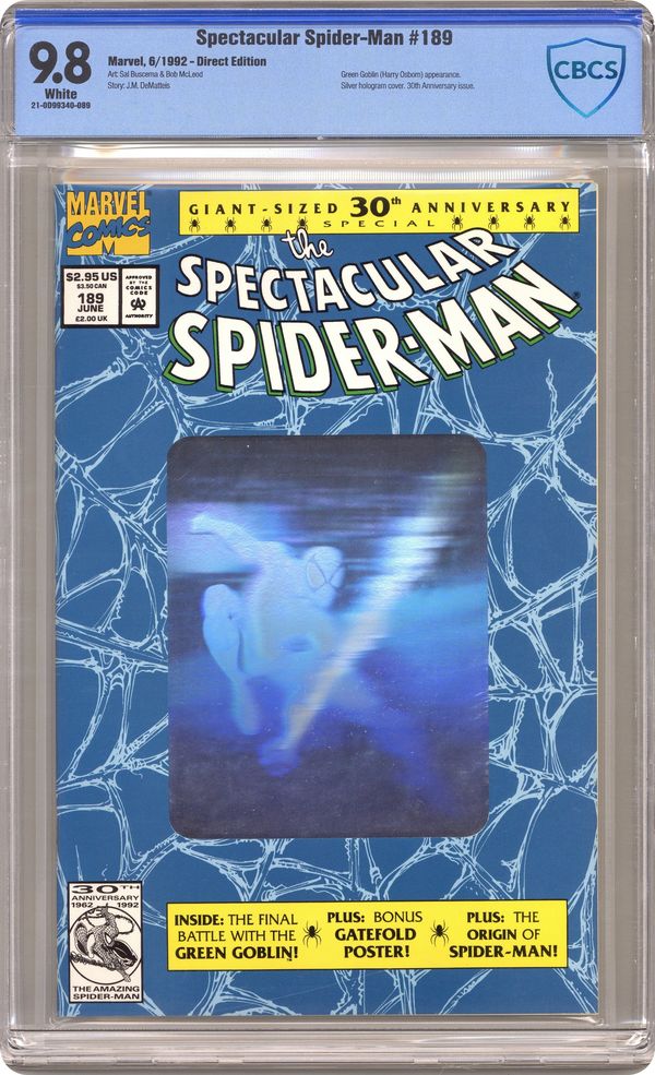 Ended Jul 3 2024 Winning Bid $47 Direct Edition. The Osborn Legacy" First printing. Giant-Sized 30th Anniversary Special Issue. Silver hologram cover. Script by J.M. DeMatteis. Pencils and Inks by Sal Buscema. Harry Osborn has battled psychological problems his entire adult life, but this time hes really gone off the deep end! The Green Goblin kidnaps his wife, son, and brother-in-law (aka the Molten Man) and takes the trio to his fathers old house in the suburbs. For the first time Harry wears the goblin costume in front of his young son. However, Normie doesnt seems to understand the gravity or depravity of the situation and enjoys his fathers ranting and raving while the family sits down for dinner! Fortunately, the goblins diatribe buys the web-slinger time to track down his green and purple foe! And with help from the Molten Man, the Amazing Spider-Man battles the Green Goblin one more time! Second Story: The Night the World Died Script by J.M. DeMatteis. Pencils and Inks by Bob McLeod. Aunt May still has nightmares about the night her husband, Ben Parker, was killed. But her recent encounter with Spider-Man (during the ordeal with the Vulture) has surprisingly brought her comfort. (Notes: This issue includes a fold out poster by Charles Vess featuring Spider-Man and the Hobgoblin. The second printing has a gold hologram cover and was published in November 1992.) 48 pages Cover price $2.95. Grade: CBCS 9.8 explanation of grade Condition: Used (collectible)