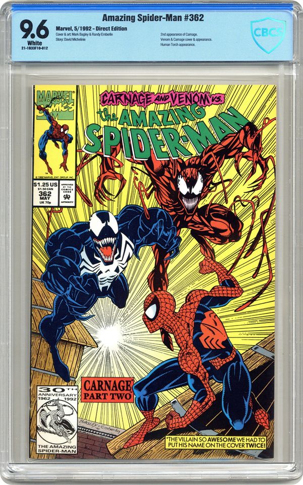 First Printing. Direct Edition. "Savage Alliance!" Part 2 of 3. Guest-starring the Human Torch. Script by David Michelinie. Pencils by Mark Bagley. Inks by Randy Emberlin. Cover by Mark Bagley and Randy Emberlin. After getting a taste of Carnage's raw power last issue, the wall-crawler knows he needs serious help! To that end the amazing one does the unthinkable! He pays a visit to Venom! Wow, is that a good idea? However as a precaution the web-slinger brings Johnny Storm along for the ride to Venom's deserted island! And following an intense battle, Venom surprisingly agrees to help his good pal Spidey! So in a truly unlikely pairing, the Spectacular Spider-Man and the Lethal Protector join forces to take down Carnage! You have to see it to believe it! Cameo appearance by J. Jonah Jameson. (Note: The issue includes a full-page ad for the Toxic Crusaders (1992) series with art by Sam Kieth.) 36 pages. $1.25 cover price. Cover price $1.25. Grade: CBCS 9.6 explanation of grade Condition: Used (collectible)