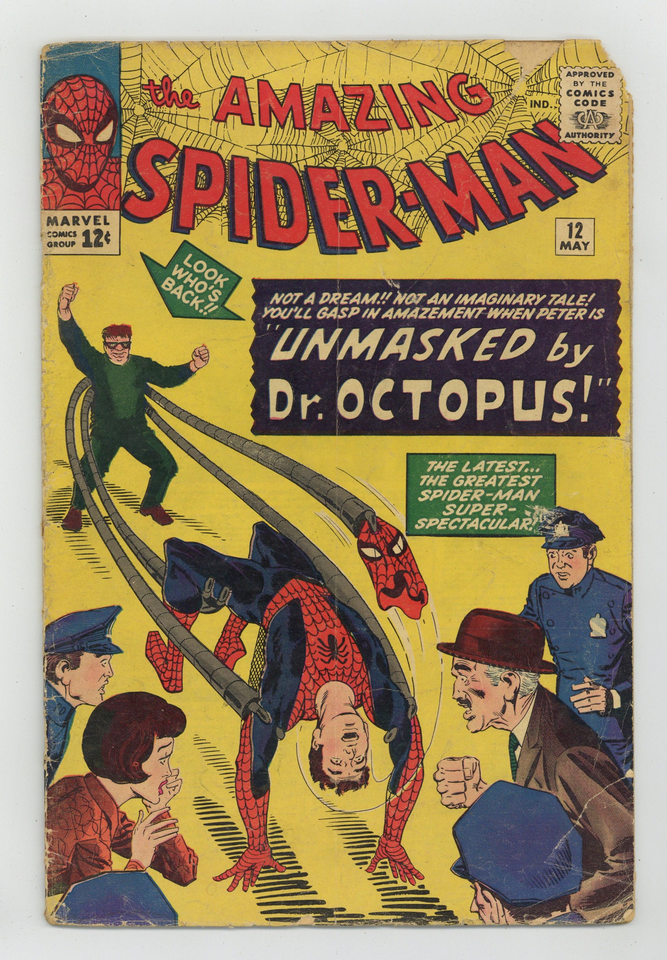 Cover art by Steve Ditko. Unmasked by Dr. Octopus!, script by Stan Lee, art by Steve Ditko; Peter has the 24 hour flu when Doc Ock captures Betty Brant in hopes of luring Spider-Man into battle; Ock beats the under the weather web-head and unmasks him, but everyone thinks it is just Peter trying to be brave by impersonating Spidey; Once he has recovered, Spider-Man battles through the wild animals Ock has released from the zoo to take on old six-arms himself. Reprinted in Marvel Tales # 149. Letter to the editor from comics artist Dave Cockrum. 36 pgs. $0.12. Cover price $0.12. Grade: FR/GD 1.5 explanation of grade Condition: Used (collectible)
