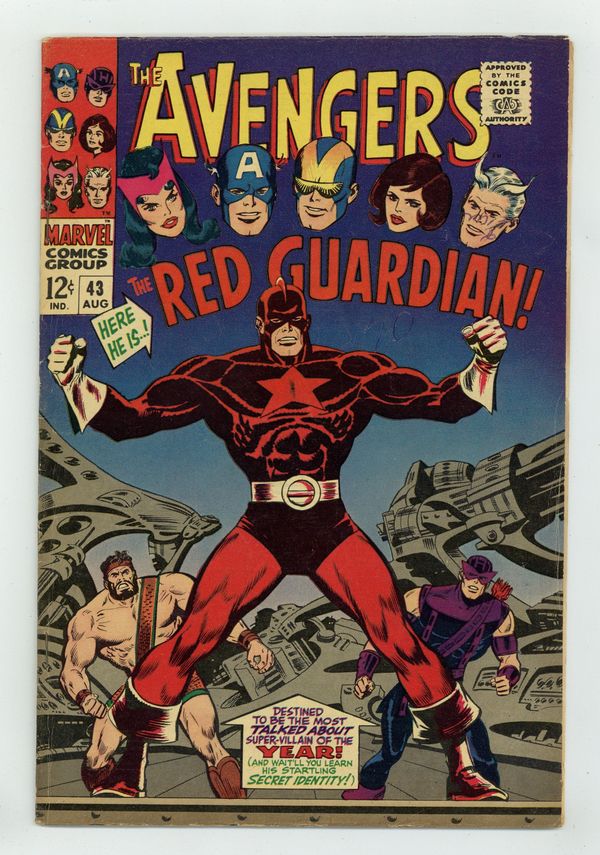 First appearance of the Red Guardian in "Color Him...the Red Guardian!" Part 1 of 2. Script by Roy Thomas. Pencils by John Buscema. Inks by George Roussos (as George Bell). Cover by John Buscema and George Roussos. After receiving a tip concerning the Black Widow's whereabouts, Hawkeye andHercules travel to the Far East to rescue her! But her communist captors have created a super-powered adversary to oppose them: the Red Guardian! Once the Prince of Power and the ace archer arrive in the Middle Kingdom, they defeat the guard force and challenge the Red Guardian! However thecommunist champion is smart and tough! He uses the Psychotron to confuse Hercules -- and next uses his belt weapon to knock out Hawkeye. And then while basking in the glow of his victory, the guardian makes a shocking announcement: Natasha Romanoff is his wife! What a red-letter day for the Red Guardian! Avengers Lineup: Captain America, Goliath, Hawkeye, Hercules, Quicksilver, Scarlet Witch, and the Wasp. (Note: This story was reprinted in Marvel Triple Action #35.) 36 pages. Cover price $0.12. Grade: VG+ 4.5 explanation of grade Condition: Used (collectible)