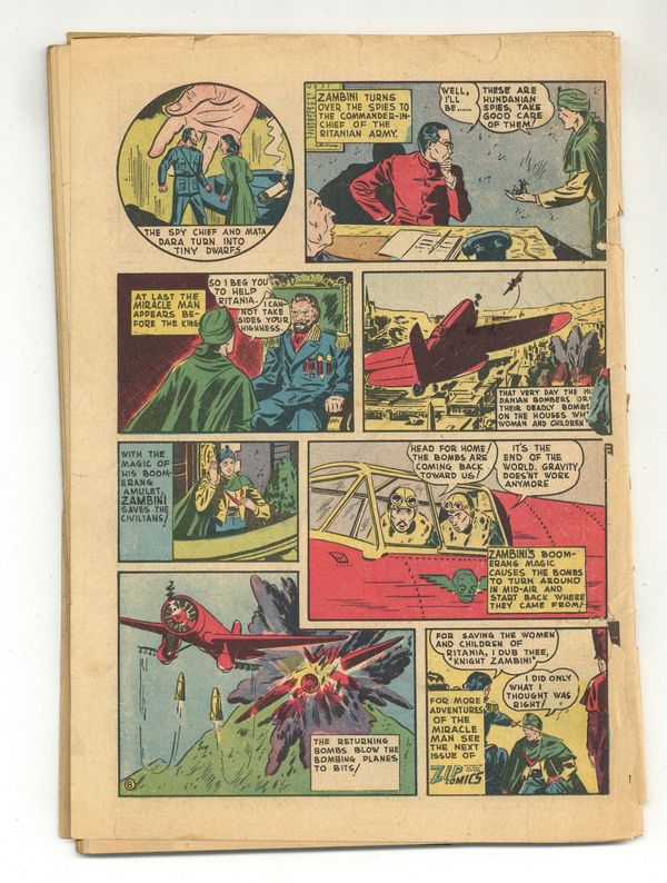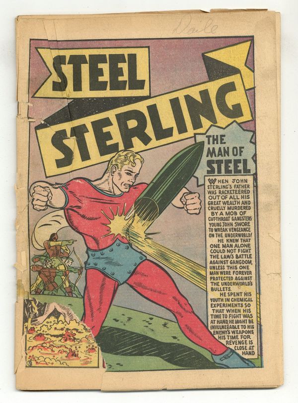 Edited by Abner Sundell. Cover art by Charles Biro. Untitled story starring Steel Sterling, The Man of Steel, script by Abner Sundell, art by Charles Biro; John Sterling completes the chemical formula which will completely protect him from the underworld's bullets, unlike his murdered father who was killed by a group of ruthless gangsters; John bathes himself in the formula, which has been poured into a cauldron of molten steel......dives in, and emerges as a man with the resistance, the magnetism and the strength of steel. Untitled story starring The Scarlet Avenger, Gang Buster, script by Harry Shorten, art by Irv Novick; Jim Kendall has devoted himself to wiping out gangland since the death of his wife and child while flying in a hijacked plane, which crashed, and in which all were killed except Jim; In the accident, his face muscles were paralyzed and Jim became the man who never smiled; Kendall has a giant scientific brain, and uses that science to the aid of his crusade. Untitled story, art by Frank Volp; The Cattleman's Association has sent Nevada Jones to help Irene Cox prevent her herd being stolen by rustlers. Untitled Kalthar, The Giant Man, King of the Jungle story, script by Harry Shorten, art by Lin Streeter. "The Devil's Flying Twins," art by Ed Smalle, Jr.; The Shane twins are rich Americans who join the British Air Force to continue a feud with the German sportsman, Herr Schultz. "You Can't Win!", art by Mort Meskin; Executions are likely to be drably gruesome affairs even to the most hardened newspapermen. "The Pirates of Ho Tsin," script by Abner Sundell, art by Mort Meskin; Captain Valor resigns his commission in the U.S. Marine Corps to seek adventure, and, aided by Ronnie and Angie, heads to China to battle the evil Ho Tsin. "The Eye of Oglu," script by Abner Sundell, art by Edd Ashe; A young girl's father is missing after a series of weird happenings; She suspects foul play and contacts Dudley for help; He dons a purple costume with yellow cape and ventures out to help as Mr. Satan, international detective and soldier of fortune. "The Ritania-Hundaria War," script by Joe Blair, art by Elmer Wexler; The king of Ritania begs Zambini to help him win the war against Hundania; Hundanian spies place a huge and deadly cobra, whose bite means death, in Zambini's bedroom. 68 pgs., full color. Cover price $0.10. Grade: Coverless explanation of grade Condition: Used (collectible)