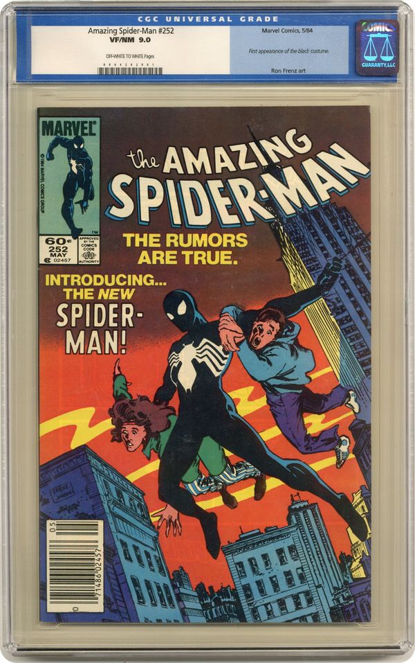 Newsstand Edition. First appearance of Spider-Man's new black (alien symbiote) costume in "Homecoming!" Plot by Roger Stern. Script by Tom DeFalco. Pencils by Ron Frenz (breakdowns) and Brett Breeding (finishes). Cover by Ron Frenz and Klaus Janson. One of the landmark issues of the Amazing Spider-Man! With a brilliant flash of light in Central Park, the wondrous wall-crawler is back! And he looks a whole lot different! Wow, a new costume! What happened during the Secret Wars on the Beyonder's world? The ominous truth will be revealed to both the readers and the web-slinger in the days and weeks ahead! Cameo appearances by the Black Cat, Dr. Curt Connors, J. Jonah Jameson, Joe Robertson , Aunt May, Captain America, Captain Marvel, Hawkeye, Iron Man, Thor, and the Wasp. (Notes: Marvel Age 12 contained sketches of the new costume two months prior to the publication of this issue. Spidey's new costume was also unveiled in Marvel Team-Up 141 and Spectacular Spider-Man 90. The first issue of the (1984) Marvel Super Heroes Secret Wars Limited Series was published the same month as Amazing Spider-Man 252. The web-slinger discovers his new costume in issue 8 of the limited series. The Frenz-Janson cover is a tribute to the iconic cover of Amazing Fantasy 15. This story was reprinted in Marvel Tales 266. The letters page contains a statement of ownership: average print run 470,527; average paid circulation: 241,762. 36 pgs. Cover price $0.60. Grade: CGC 9.0 explanation of grade Condition: Used (collectible)