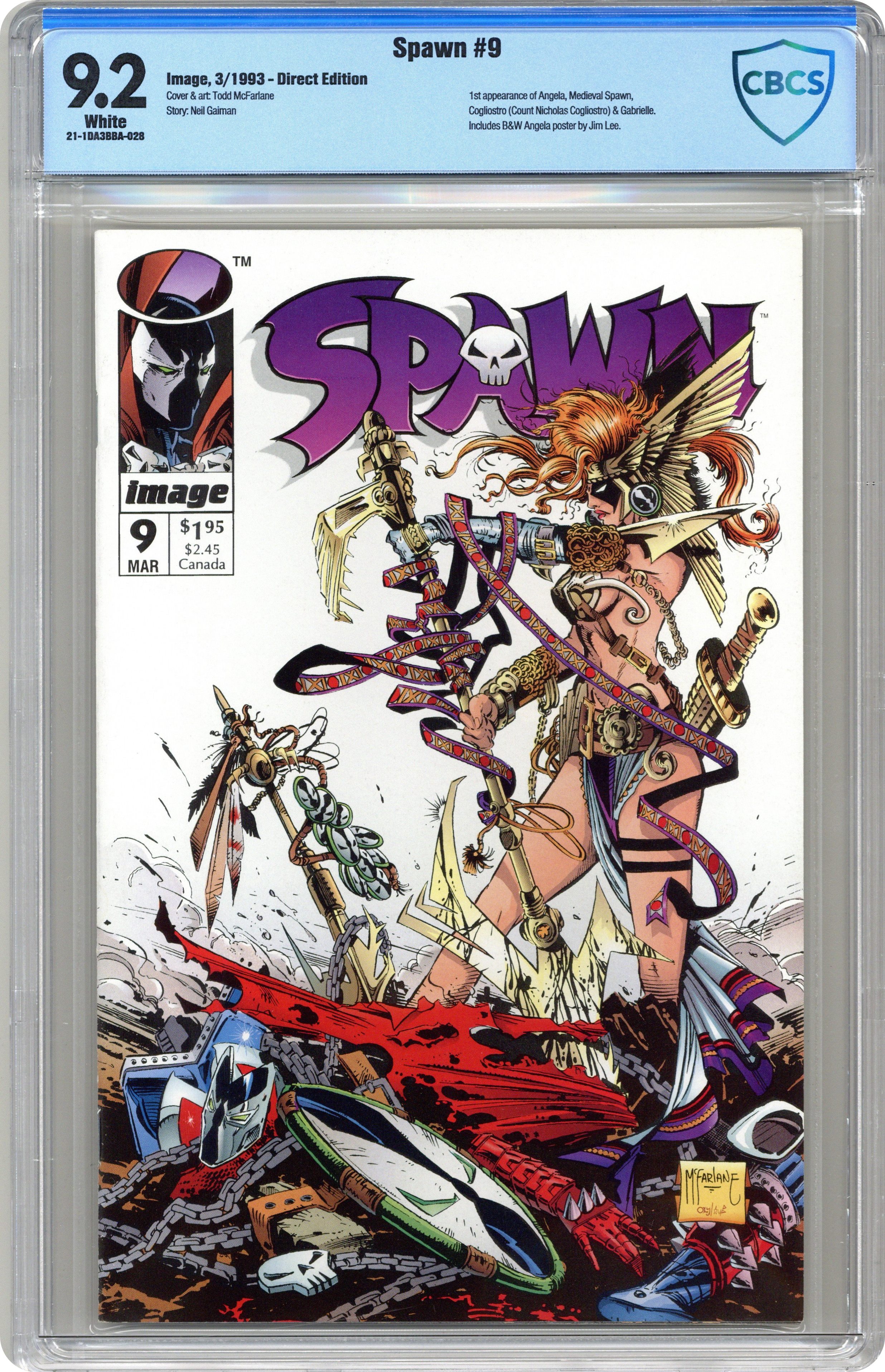 Ended Feb 7 2024 Winning Bid $34 Direct Edition. "Angela!" 1st appearance of Angela, Cagliostro, and Medieval Spawn. Story by Neil Gaiman. Art by Todd McFarlane. Spawn is attacked by Angela, a warrior of Heaven who has been hunting Hellspawns for centuries. Includes a B&W poster of Angela by Jim Lee and Todd McFarlane. Cover price $1.95. Grade: CBCS 9.2 explanation of grade Condition: Used (collectible)