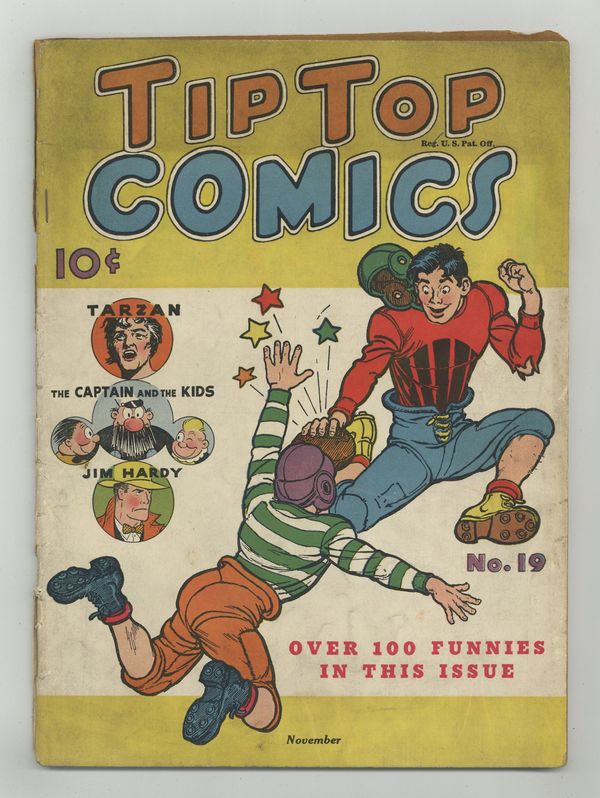 Stories and art by Hal Foster, Al Capp, Ernie Bushmiller, Bill Conselman, Charlie Plumb, Rudolph Dirks, Bernard Dibble, Dick Moores, Mo Leff, Paul Berdanier, Johnny Devlin, Harry O'Neill, Becky Sharp, Laverne Harding, H. E. Homan, R. M. Brinkerhoff, Robert Dickey, and Ben Batsford. Sometimes listed as Tip Top Comics Vol. 2 #7. Tip Top Comics presented color reprints of United Features newspaper comic strips. Tarzan's ape ally Bohgdu is injured saving Tarzan, but he has enough strength left to deal with Dester Momlu, in Tarzan Sunday strips with art by Hal Foster. The Captain and the Inspector find themselves the targets of the Kids' latest scheme. Plus a Li'l Abner storyline by Al Capp. The Captain and the Kids; Tarzan of the Apes; Peter Pat; Percy Penguin; Frankie Doodle; Cynical Susie; Broncho Bill; Looy Dot Dope; Opportunity Knox; Benny; How to Make It; Bucky and His Pals; Mr. and Mrs. Beans; Hawkshaw the Detective; How It Began; Phil Fumble; Fritzi Ritz; Back Home Again; All in the Family; Billy Make Believe; Joe Jinks; Little Mary Mixup; Swords of Suez; Ella Cinders; Chris Crusty; Danny Dingle; Li'l Abner. 64 pages, Full Color. Cover price $0.10. Grade: FR 1.0 explanation of grade Condition: Used (collectible)