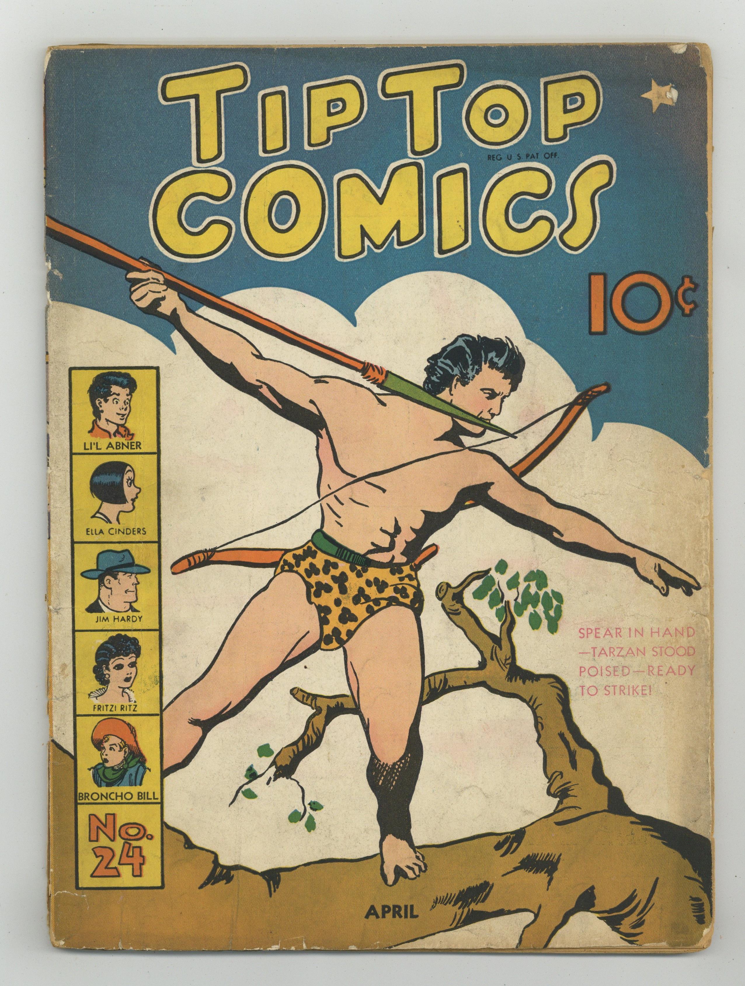 Stories and art by Hal Foster, Al Capp, Ernie Bushmiller, Bill Conselman, Charlie Plumb, Rudolph Dirks, Gus Mager, Bernard Dibble, Dick Moores, Mo Leff, Paul Berdanier, Johnny Devlin, Harry O'Neill, H. E. Homan, R. M. Brinkerhoff, Robert Dickey, and Ben Batsford. Sometimes listed as Tip Top Comics Vol. 2 #12. Tip Top Comics presented color reprints of United Features newspaper comic strips. In the modern-day Viking encampment, Tarzan tries to rescue Sigreda from being wed to Eric the Red, in Tarzan Sunday strips with art by Hal Foster. A magician turns the tables on kids playing April Fool's pranks. Plus a Li'l Abner storyline by Al Capp. The Captain and the Kids; Tarzan of the Apes; Peter Pat; Percy Penguin; Frankie Doodle; Broncho Bill; Looy Dot Dope; Opportunity Knox; Benny; How to Make It; Bucky and His Pals; Mr. and Mrs. Beans; Hawkshaw the Detective; How It Began; Phil Fumble; Fritzi Ritz; Back Home Again; All in the Family; Billy Make Believe; The Mad Moon Mine; Joe Jinks; Little Mary Mixup; Ella Cinders; Chris Crusty; Danny Dingle; Li'l Abner. 64 pages, Full Color. Cover price $0.10. Grade: FR/GD 1.5 explanation of grade Condition: Used (collectible)