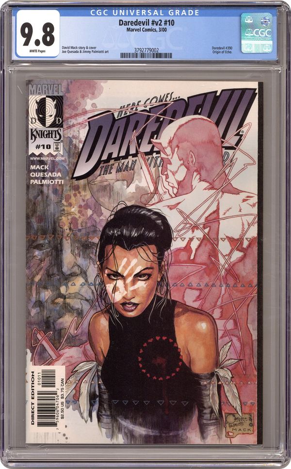 cover by quesada, PALMIOTTI & mack david mack/joe quesada/jimmy palmiotti Introducing Echo, a new villain so strange you'll swear you're hearing her name over and oer and over and...! Matt Murdock gets slapped upside the head by Cupid as a new romantic interest enters his still shattered life. But is she the lady of his dreams or a nightmare waiting to happen? Plus: Daredevil uncovers a deep dark secret thatcould destroy the Kingpin! "Quesada's art is simply gorgeous. A classic in the making and the best mainstream comic around at the moment, bar none. Score: 10 (out of 10)" -Comics International " Cover price $2.50. Grade: CGC 9.8 explanation of grade Condition: Used (collectible)