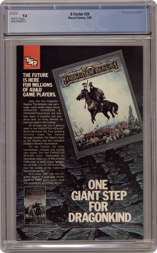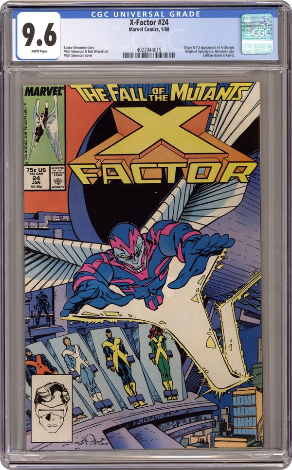 Direct Edition. Fall of the Mutants! Part 1 of 3. "Masks!" 1st full appearance of Archangel. Story by Louise Simonson. Art by Walter Simonson and Bob Wiacek. One of the biggest mutant events to ever hit the comic racks begins here. The powerful mutant known as Apocalypse finally makes his move and unleashes his Four Horseman on an unsuspecting world. The only thing standing between humanity and total annihilation is X-Factor. However when the fourth and final Horseman, Death, reveals his true identity, the group will be rocked to its very core. This is a pivotal chapter in the lives of the original X-Men. Cover price $0.75. Grade: CGC 9.6 explanation of grade Condition: Used (collectible)