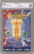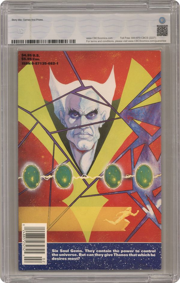 1st Printing. "Games and Prizes!" Written by Jim Starlin. Art by Ron Lim John Beatty. In order to obtain ultimate power, the Mad Titan will challenge the Elders of the Universe for this prize. Six Soul Gems. They contain the power to control the universe. But can they give Thanos that which he desires most? Featuring the Elders of the Universe the Runner, Collector and the Grandmaster. NOTE: Story continues in Silver Surfer (1987 2nd Series) #44. 48 pages, FC. Cover price $4.95. Grade: CBCS 9.8 explanation of grade Condition: Used (collectible)
