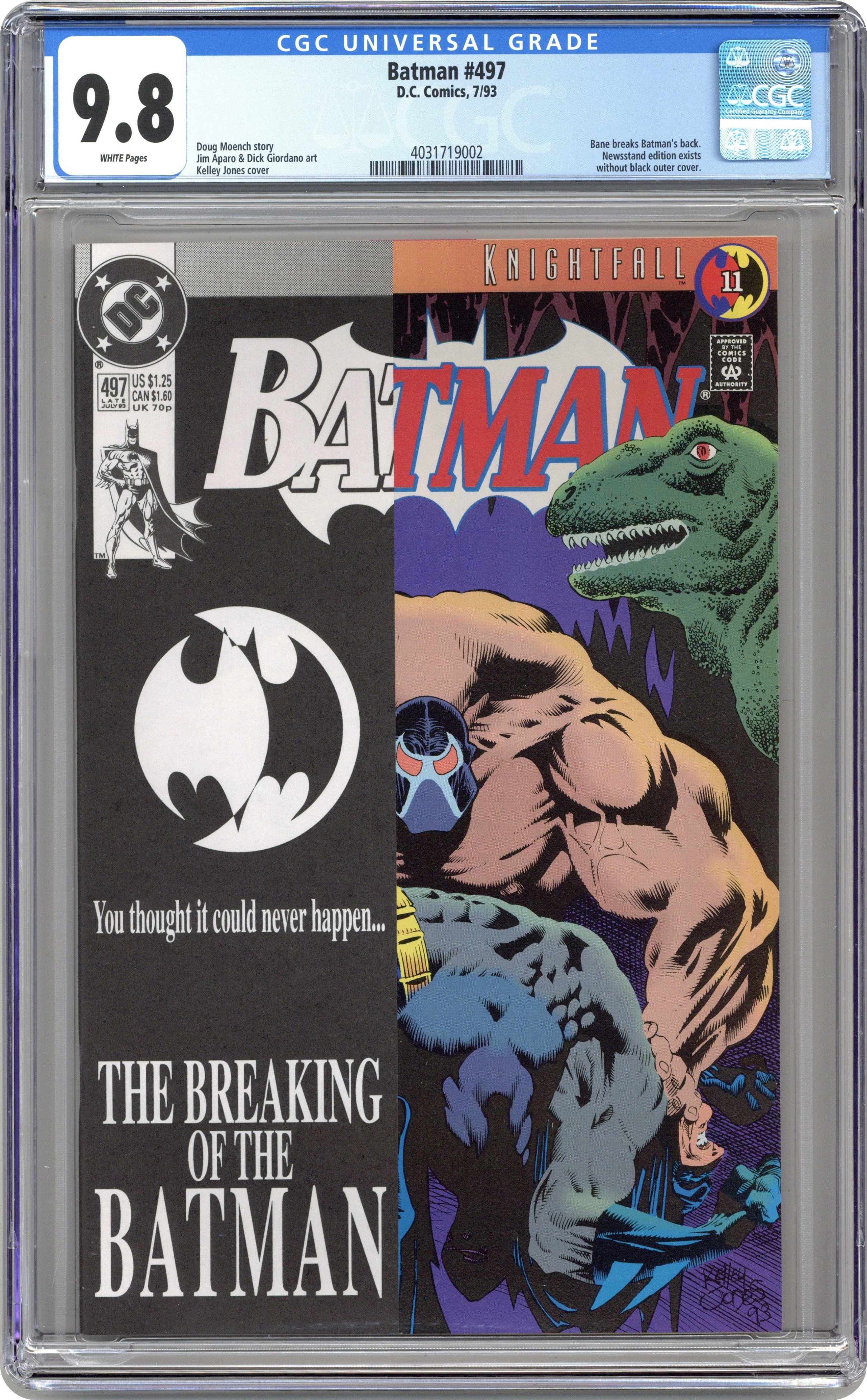 Ended Jan 20 2024 Winning Bid $85 Direct Edition with Overlay cover. Bane breaks Batman's back in Batman KnightFall Part 11. Home turf does not prove an advantage when Bane breaks Batman's back in the Batcave in "The Broken Bat." KnightFall continues in Detective Comics (1937- ) #664. Written by Doug Moench. Pencils by Jim Aparo. Inks by Dick Giordano. Cover by Kelley Jones. 36 Pages, Full Color. Cover price $1.25. Grade: CGC 9.8 explanation of grade Condition: Used (collectible)