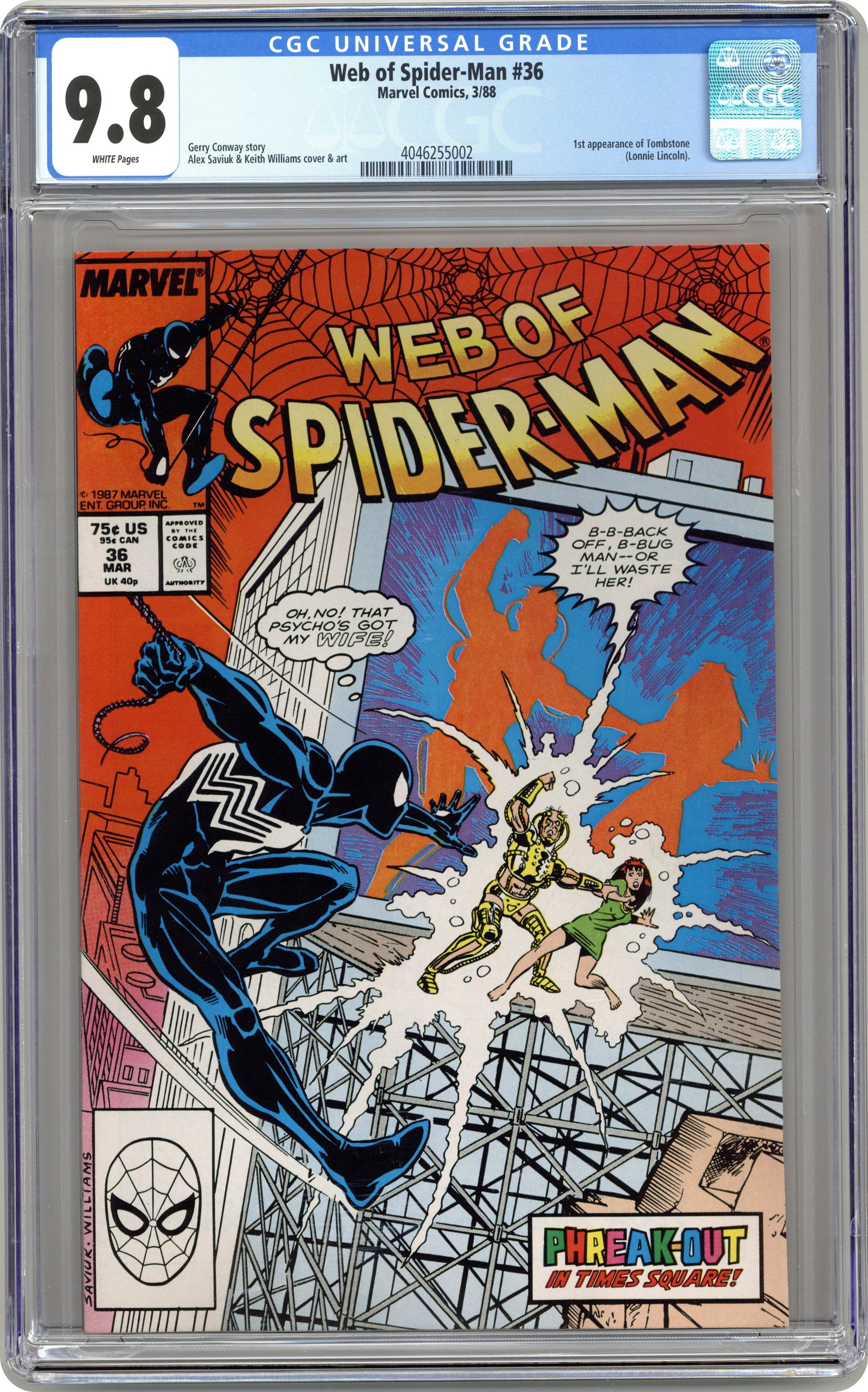 Direct Edition. "Phreak-Out!" Story by Gerry Conway. Art by Alex Saviuk and Keith Williams. The young scientist from the previous issue is still on the loose, and now he has built his own powerful exo-skeleton. The Phreak goes to Peter Parker's apartment and abducts Mary Jane; setting the stage for a showdown with Spider-Man over Times Square! Meanwhile, Joe Robertson is horrified to see a chilling old acquaintance and a soon-to-be new villain for Spider-Man. First appearance of Tombstone. 32 pages Cover price $0.75. Grade: CGC 9.8 explanation of grade Condition: Used (collectible)