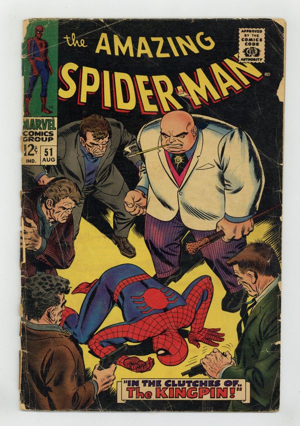 Cover by John Romita Sr. Second appearance of the Kingpin in In the Clutches of...the Kingpin!, script by Stan Lee, pencils by John Romita, inks by Mike Esposito (as Mickey Demeo); When the Kingpin orders that J. Jonah Jameson be silenced for his negative press on Fisk's illegal activites, Spidey swings in to save the EIC; But can the Wallcrawler take the big guy in a one-on-one brawl? Reprinted in Marvel Tales # 36. 36 pages, full color. Cover price $0.12. Grade: PR 0.5 explanation of grade Condition: Used (collectible)