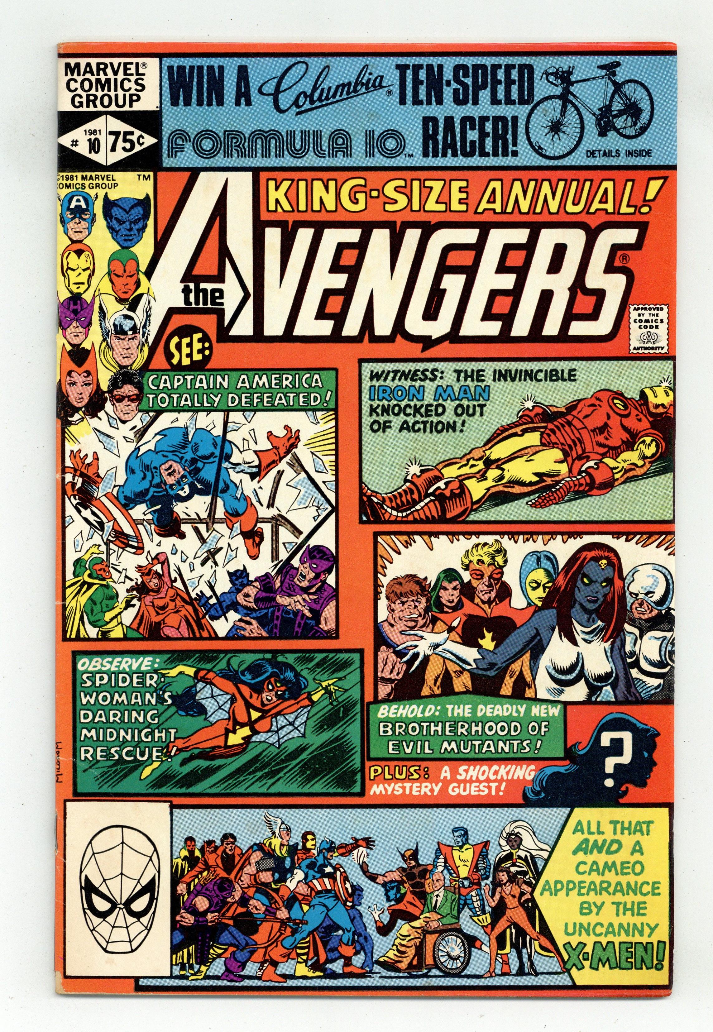 Direct Edition. First appearance of Rogue and Madelyne Pryor in "By My Friends Betrayed!" Spider-Woman, X-Men, Carol Danvers, and New Brotherhood of Mutants guest star. Script by Chris Claremont. Pencils by Michael Golden. Inks by Armando Gil. Cover by Al Milgrom. This action-packed annual has got it all, true believers: the first appearance of Rogue, the spectacular art of Michael Golden, the tragic return of Carol Danvers, and the stupendous struggle between the Brotherhood of Evil Mutants and the mighty Avengers! Following the events of Uncanny X-Men #142, Mystique & her New Brotherhood of Evil Mutants attempt to break four of their members out of Ryker's Island prison! After Rogue and Mystique take down Captain America, Iron Man, and Thor, the rest of the Avengers and Spider-Woman catch up to the villains, and the epic clash erupts! Woven in and around the frantic action at Ryker's Island is the heartbreaking story of Carol Danvers' return to Earth. Her life has fallen apart since leaving for Limbo with Marcus Immortus in Avengers #200, and now, stripped of her powers and memories, Carol begins the long road to recovery. And the first step is an emotional confrontation with her former teammates! Notes: Marvel Super-Heroes #11 (Fall 1992) fills in the details of Carol Danvers' life between Avengers #200 and Avengers Annual #10. The Thing stars in a one-page Hostess ad, "A Lesson to Be Learned!" This issue was reprinted in 1993 in the trade paperback: The Greatest Battles of the Avengers. 52 pages, full color. Cover price $0.75. Grade: VG+ 4.5 explanation of grade Condition: Used (collectible)