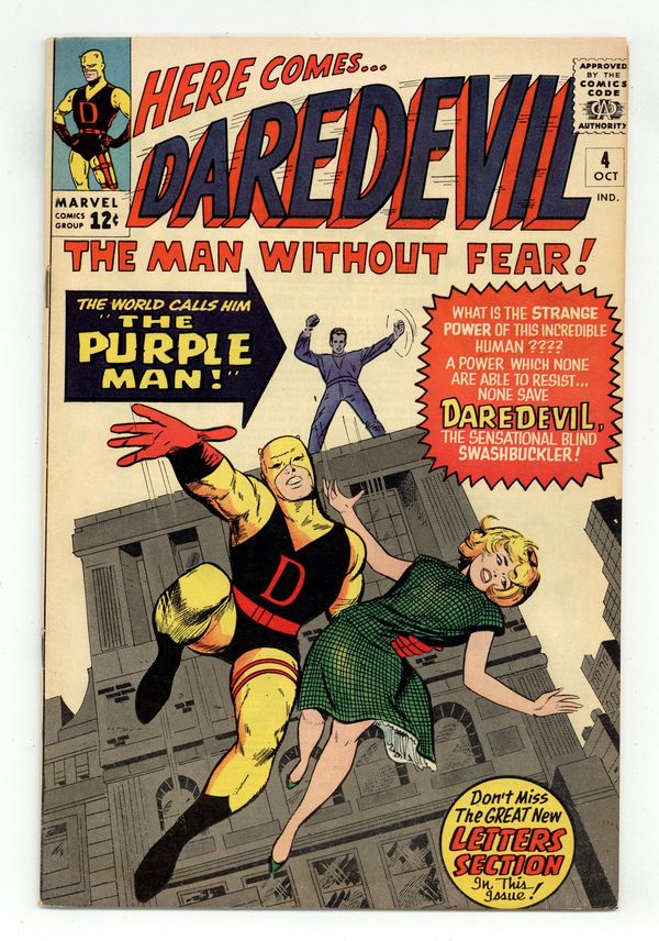 Cover pencils by Jack Kirby, inks by Vince Colletta. First appearance of the Purple Man in Killgrave, the Unbelievable Purple Man!, script by Stan Lee, pencils by Joe Orlando, inks by Vince Colletta; DD runs up against a purple man who can make anyone do what he wants just by suggesting it. First letters page. 36 pgs. Cover price $0.12. Cover price $0.12. Grade: FN 6.0 explanation of grade Condition: Used (collectible)
