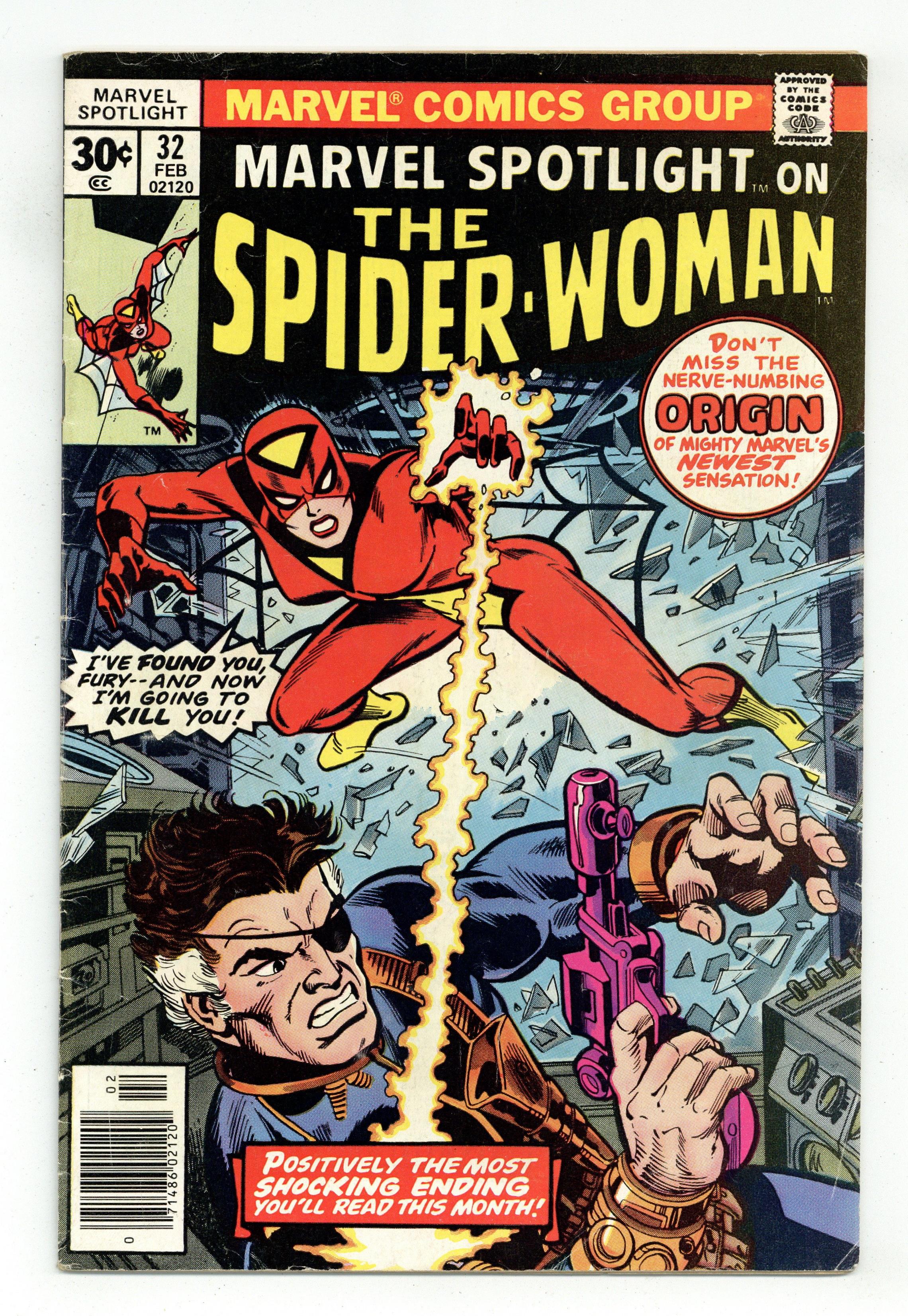 Origin and 1st appearance of Spider-Woman. Cover pencils by Gil Kane and John Romita (alterations), inks by Dick Giordano (?) and John Romita (alterations). Dark Destiny!, script by Archie Goodwin, pencils by Sal Buscema (breakdowns) and Jim Mooney (finished art), inks by Jim Mooney; the mysterious Spider-Woman is tricked by Hydra into trying to kill Nick Fury. Continued in Spider-Woman #1. 36 pages, full color. Cover price $0.30. Grade: GD/VG 3.0 explanation of grade Condition: Used (collectible)