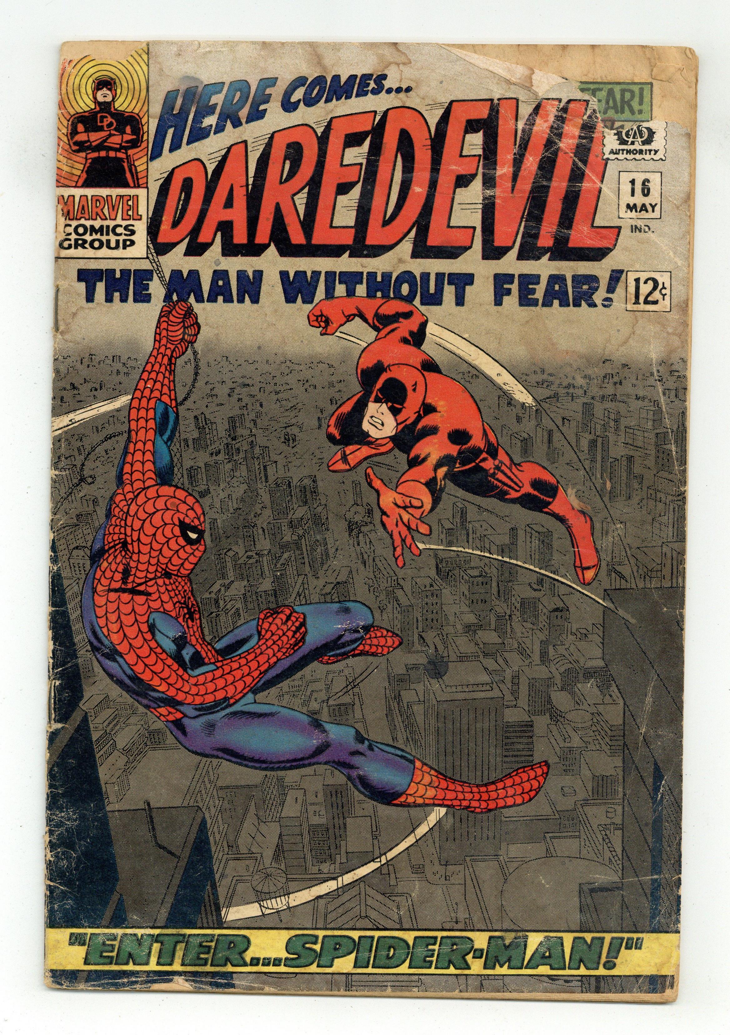 Cover pencils by John Romita, inks by Frank Giacoia. Spider-Man guest stars in Enter Spider-Man!, script by Stan Lee, pencils by John Romita Sr., inks by Frank Giacoia (as "Frank Ray"); The Masked Marauder comes up with a plan to pit Spidey and DD against each other while he makes off with an experimental engine; First appearance of the Masked Marauder. Letter to the editor from comics retailer Bud Plant. 36 pgs. 36 pgs. Cover price $0.12. Cover price $0.12. Grade: FR 1.0 explanation of grade Condition: Used (collectible)