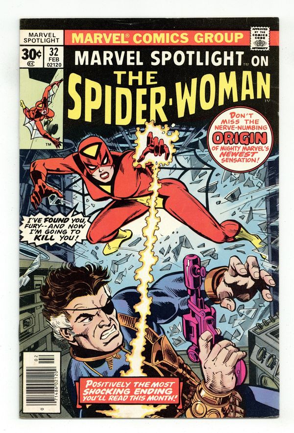 Origin and 1st appearance of Spider-Woman. Cover pencils by Gil Kane and John Romita (alterations), inks by Dick Giordano (?) and John Romita (alterations). Dark Destiny!, script by Archie Goodwin, pencils by Sal Buscema (breakdowns) and Jim Mooney (finished art), inks by Jim Mooney; the mysterious Spider-Woman is tricked by Hydra into trying to kill Nick Fury. Continued in Spider-Woman #1. 36 pages, full color. Cover price $0.30. Grade: VG+ 4.5 explanation of grade Condition: Used (collectible)