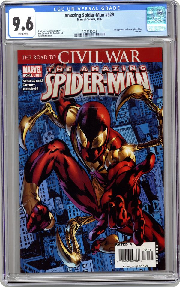 Ended Jul 13 2023 Winning Bid $44 Direct Edition. $2.50 cover price. Written by J. MICHAEL STRACZYNSKI. Pencils by RON GARNEY. Cover by BRYAN HITCH. Clothes make the man. At least that's what Tony Stark seems to think. Transformed by his experiences during "The Other" saga, Peter Parker stands poised for the next chapter of his life. And to mark the occasion, Tony has got a very special present: a new Spider-Man costume that's certain to raise eyebrows! Check out the new costume in this issue! 36 pgs. Cover price $2.50. Grade: CGC 9.6 explanation of grade Condition: Used (collectible)