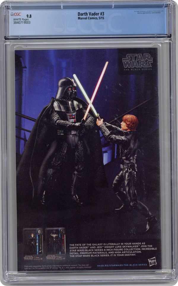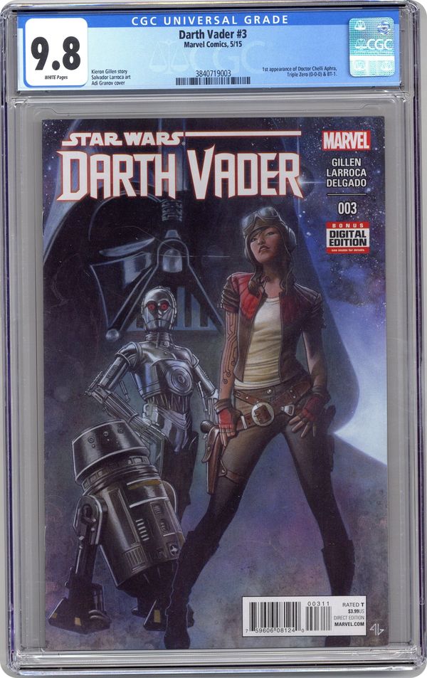 Written by Kieron Gillen. Art by Salvador Larroca. Cover by Adi Granov. When a Dark Lord needs help, who can he turn to? Meet Aphra-the galaxy's foremost raider of lost weaponry! Plus: could these be the deadly droids she's looking for? 28 pages, full color. Rated T Cover price $3.99. Grade: CGC 9.8 explanation of grade Condition: Used (collectible)