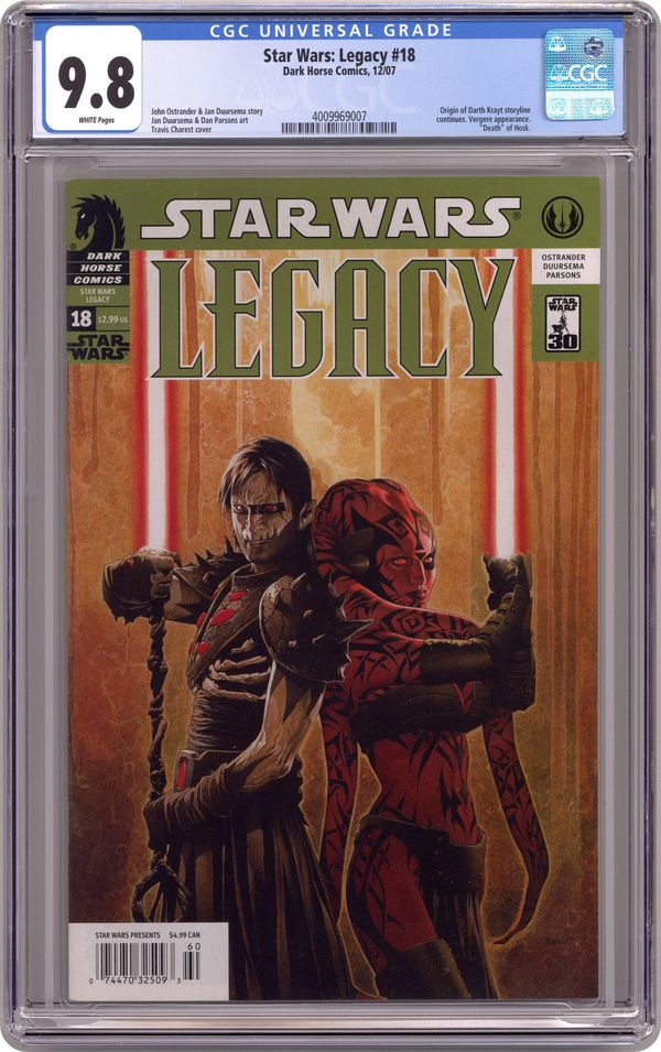 Claws of the Dragon: Part 5 of 6 - Written by John Ostrander and Jan Duursema. Art by Jan Duursema and Dan Parsons. Cover by Travis Charest. Hoping to free their friend Cade Skywalker from the clutches of the Sith, Deliah Blue and Jeriah Syn receive help from a surprising source. And Cade, who was captured by the Sith while trying to free Jedi Hosk Tre'Lyis, discovers that Hosk has found his own path to freedom, via the Force. The good, evil, and those in-between are coming together, and the result is going shake the foundations of the Empire! ? This is the future of Star Wars, the continuation of the story that started in the original trilogy, and none of it has been seen before. The full story of Darth Krayt's origin is revealed! Cover price $2.99. Grade: CGC 9.8 explanation of grade Condition: Used (collectible)