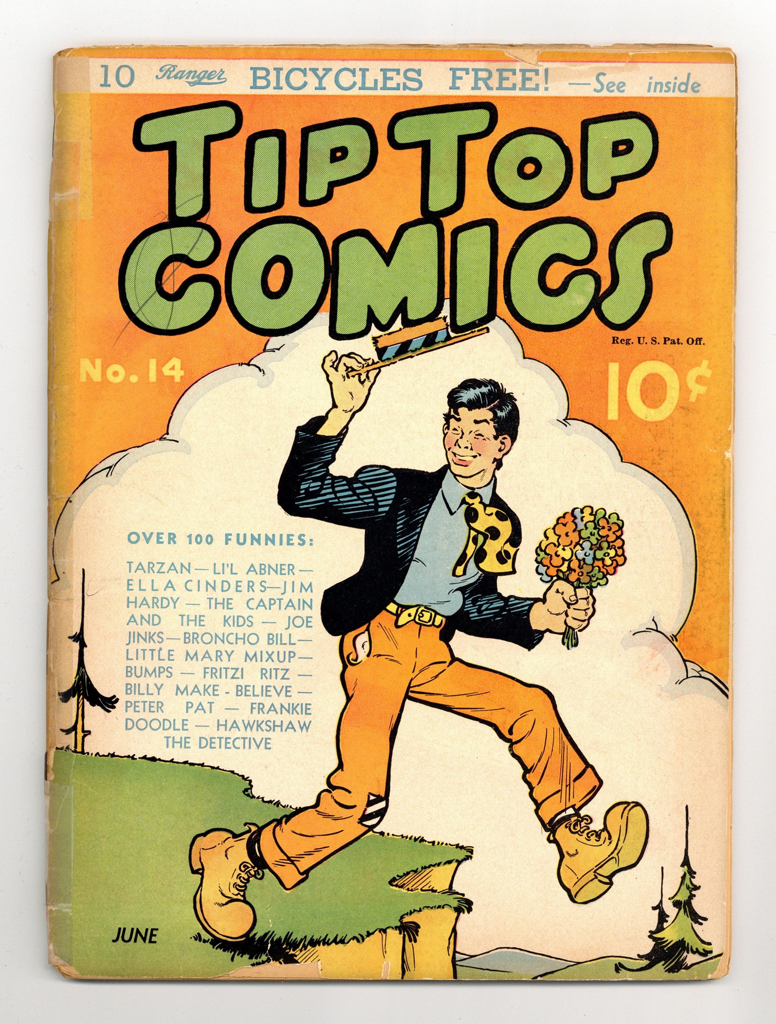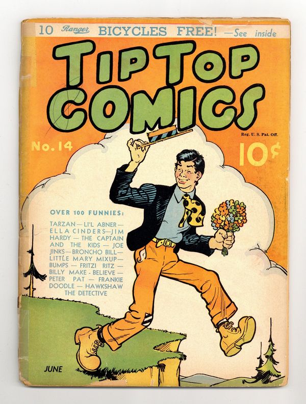 Cover by Al Capp. Stories and art by Hal Foster, Al Capp, Ernie Bushmiller, Bill Conselman, Charlie Plumb, Bernard Dibble, Rudolph Dirks, Mo Leff, Paul Berdanier, Becky Sharp, Laverne Harding, Harry O'Neill, H. E. Homan, R. M. Brinkerhoff, Robert Dickey, and Fred Methot. Sometimes listed as Tip Top Comics Vol. 2 #2. Tip Top Comics presented color reprints of United Features newspaper comic strips. At the conclusion of his Egyptian adventure, Tarzan must brave a river of crocodiles, in "The Egyptian Saga" with art by Hal Foster. A flaming arrow starts a fire on Broncho Bill's Circle-B Ranch. An escaped gorilla is on the loose in Dogpatch, in a Li'l Abner storyline by Al Capp. The Captain and the Kids; Tarzan of the Apes; Peter Pat; Percy Penguin; Frankie Doodle; Be a Cartoonist; Cynical Susie; Broncho Bill; Looy Dot Dope; Benny; How to Make It; Bucky and His Pals; Mr. and Mrs. Beans; Hawkshaw the Detective; How It Began; Phil Fumble; Fritzi Ritz; All in the Family; Billy Make Believe; Ghost Plane of Geyser Gulch; Joe Jinks; Little Mary Mixup; Ella Cinders; Chris Crusty; Danny Dingle; Li'l Abner. 64 pages, Full Color. Cover price $0.10. Grade: PR 0.5 explanation of grade Condition: Used (collectible)