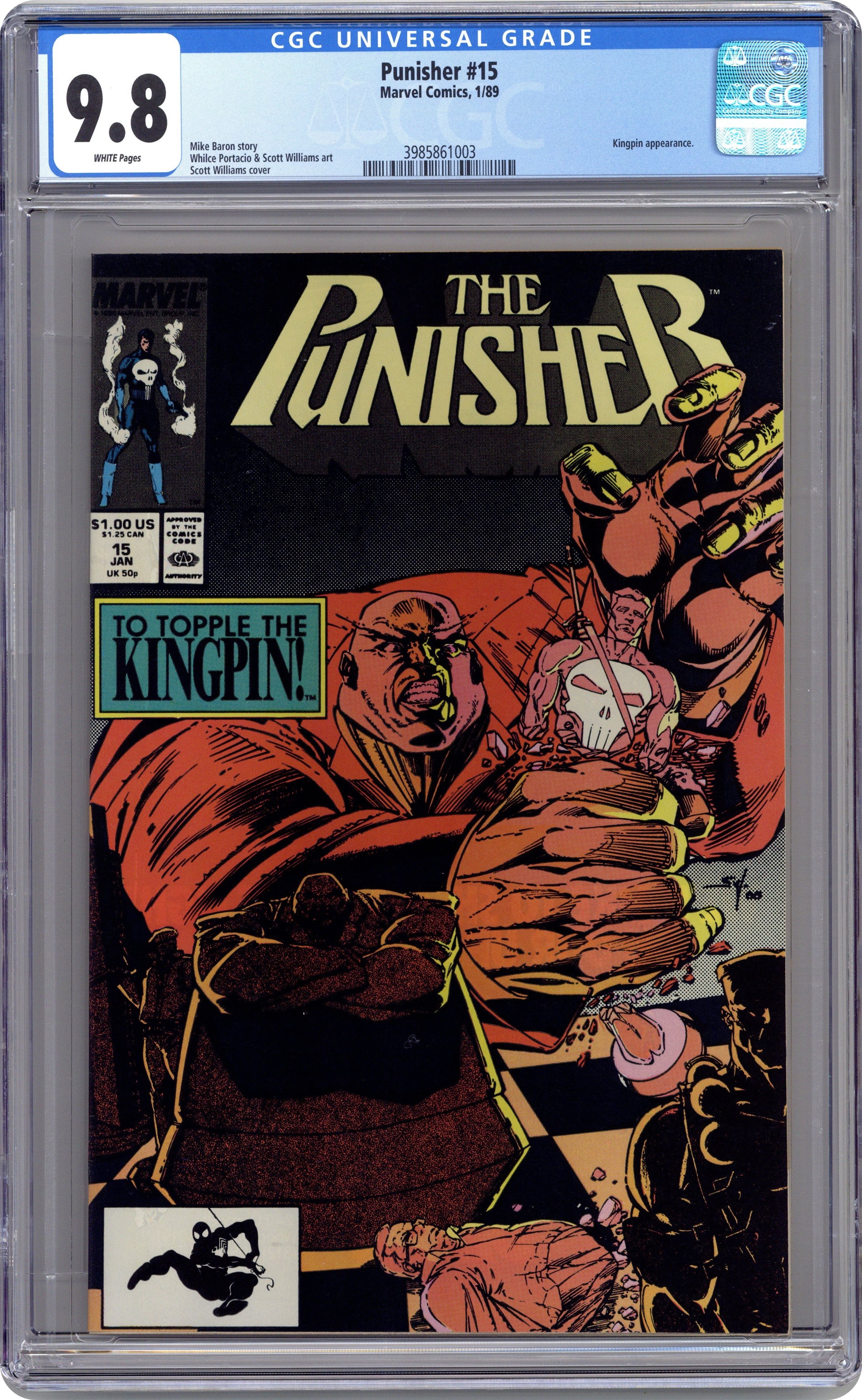 Story by Mike Baron. Art by Whilce Portacio and Scott Williams. Frank assembles a unit of like minded revenge seekers in order to train them for the war on crime and to take down the biggest fish of all, the Kingpin of Crime. However, Wilson Fisk is not one to go down without a fight. As Castle trains his recruits, the Kingpin sends the deadly killer Mr. Kliegg to end the Punisher's threat to his criminal empire. 32 pages. Cover price $1.00. Grade: CGC 9.8 explanation of grade Condition: Used (collectible)
