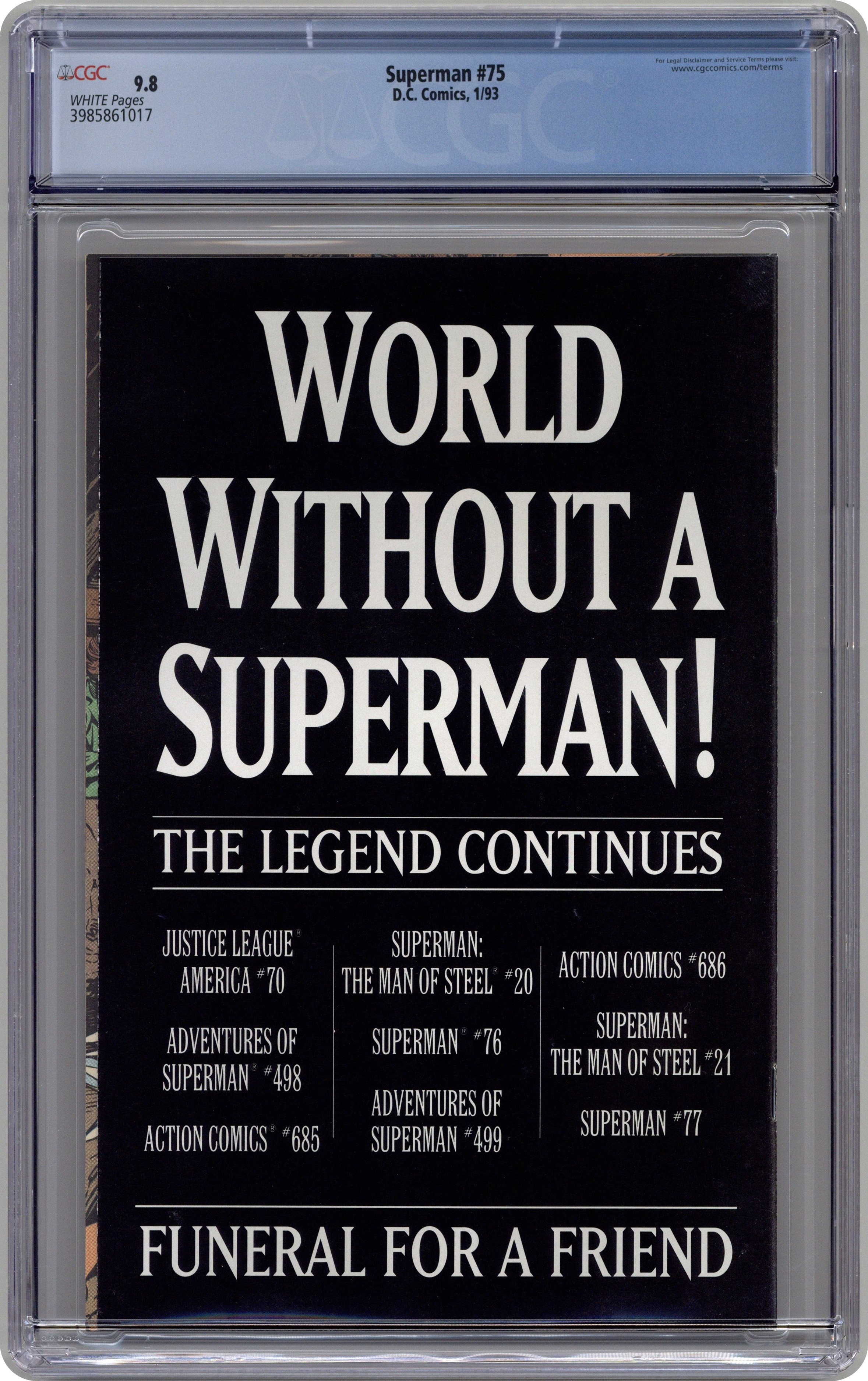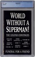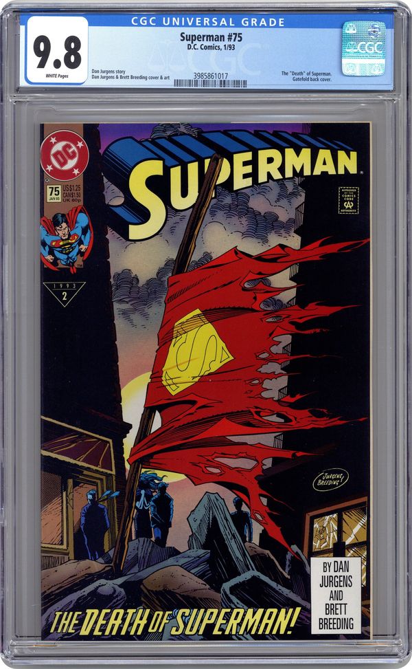 1st printing. Doomsday! Part 7 of 7. "Doomsday!" Story by Dan Jurgens. Art by Dan Jurgens and Brett Breeding. Here it is, the issue that rocked the DC Universe. An unstoppable force named Doomsday crash landed on Earth and has cut a swath of death and destruction across the country, all the way to Metropolis. Even the Justice League, the world's premiere super-team, was powerless before this creature's might. Now one man stands defiantly in Doomsday's way and vows that the creature's insanity stops here. Superman fights his strongest opponent to the death in the streets of Metropolis. Cover price $1.25. Grade: CGC 9.8 explanation of grade Condition: Used (collectible)