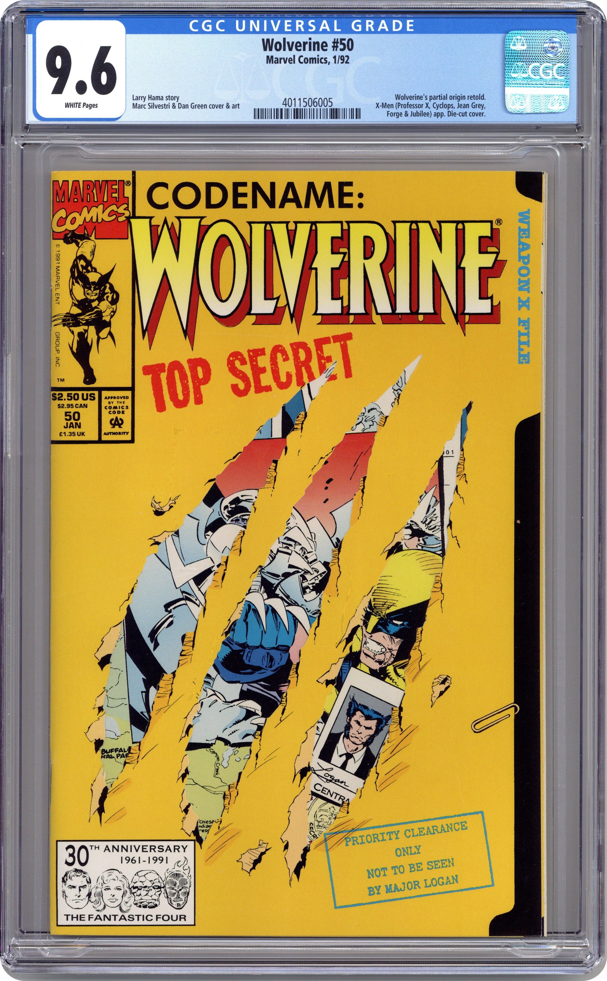 Direct Edition. Shiva Scenario: Phase 3 of 3 - "Dreams of Gore!" Guest-starring the X-Men. Written by Larry Hama. Art by Marc Silvestri and Dan Green. Wolverine discovers the location where his memory implants were created. But when he gets there he also discovers the mechanical monster known simply as Shiva, a robot programmed to hunt and kill renegade members of the Weapon X Program. Featuring pin-ups by Bill Sienkiewicz and Jim Lee. 64 pages, FC NOTE: The astounding sequel to Weapon X from Marvel Comics Presents (1988-1995) #72-84. Cover price $2.50. Grade: CGC 9.6 explanation of grade Condition: Used (collectible)