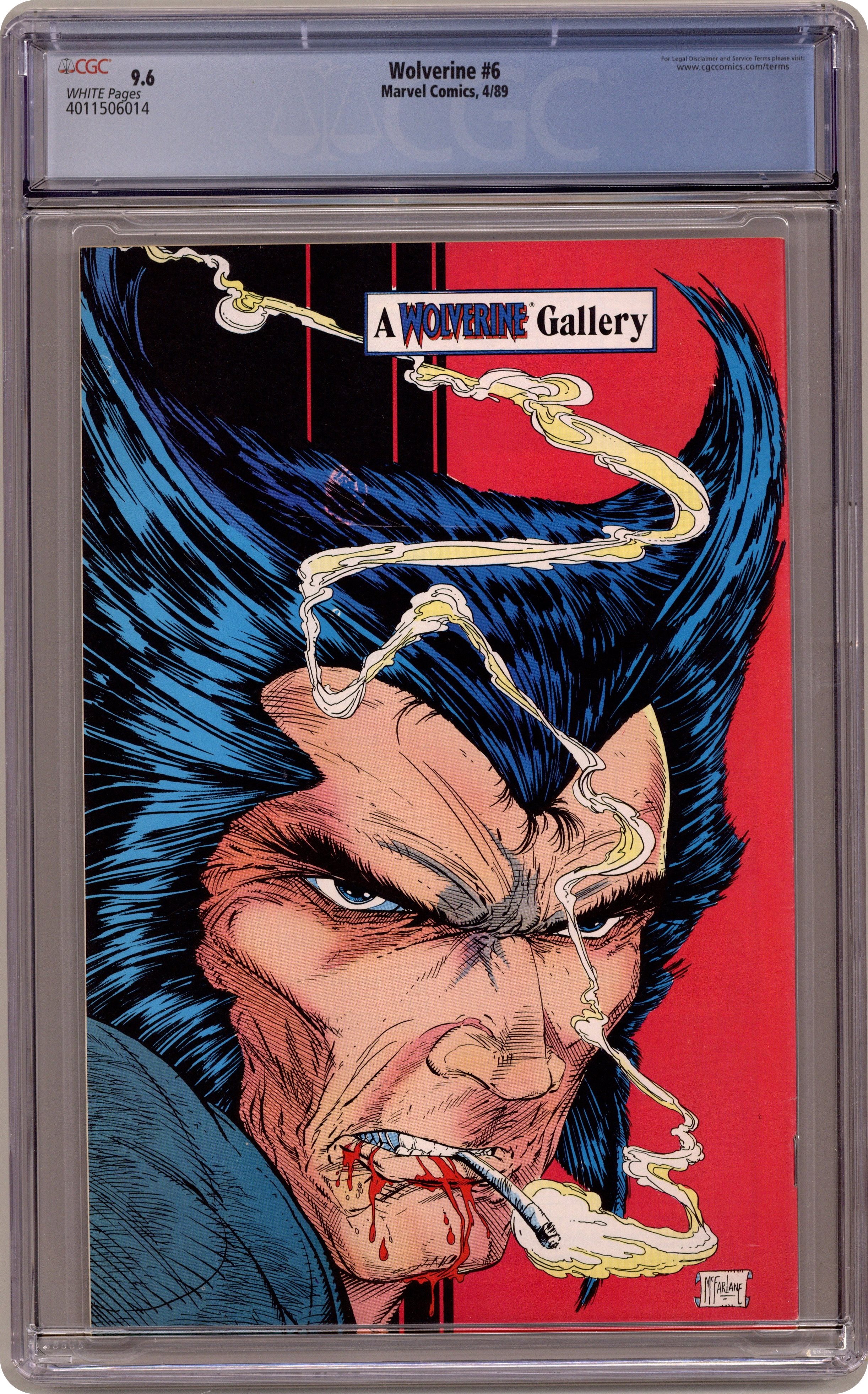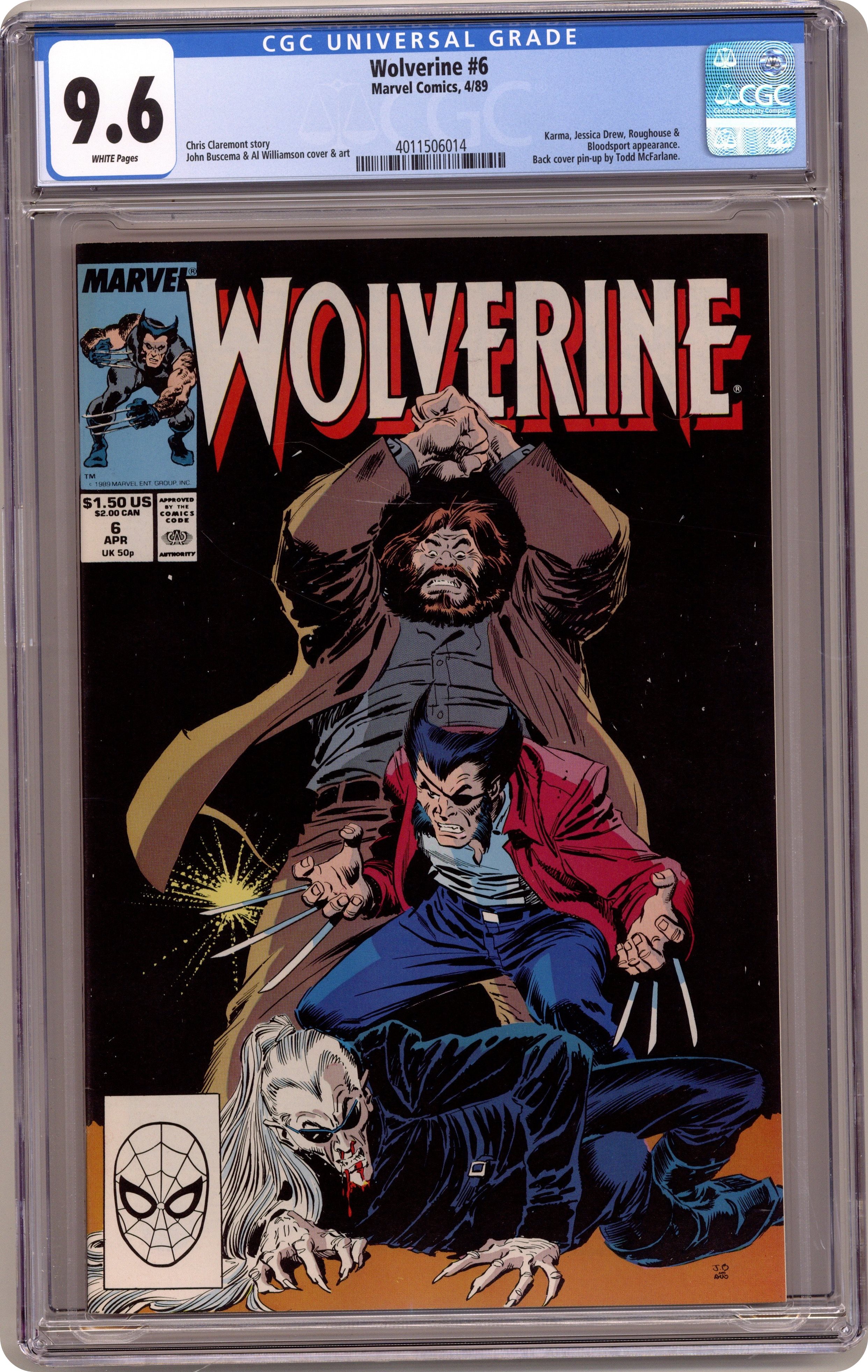 Direct Edition. "Roughhouse!" Written by Chris Claremont. Art by John Buscema and Al Williamson. At the royal palace, Wolverine takes on the behemoth Roughhouse and the deadly Bloodsport in an effort to save innocent lives. Just as things escalate to the point of no return, the Mandripoor Prince arrives in town. Todd McFarlane art on back cover. 32 pages, FC Cover price $1.50. Grade: CGC 9.6 explanation of grade Condition: Used (collectible)