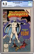 Vision Quest Part 4 of 4. "New Faces" Script by John Byrne. Pencils by John Byrne. Inks by Mike Machlan. Cover by John Byrne. The Vision has been reassembled thanks to the brilliance and hard work of Hank Pym. But complications remain. First, the Vision's appearance has changed due to the trauma his bio-synthetic skin suffered during his disassembly. And second, while Hank has restored the Vision's memories, he can't recreate the emotional attachment to them. For that the brain patterns of Simon Williams are needed. But when Wanda finds Simon and asks him to cooperate, he refuses. Then Wonder Man faces the wrath of the Scarlet Witch! Wow, the West Coast Avengers are approaching rock bottom. And the recent addition of the U.S. Agent is not helping. (Notes: The cover to this issue is an homage to John Buscema and George Klein's classic cover to Avengers (1st series) #57 -- the first appearance of the silver age Vision. The white Vision debuted in the MCU in the final episode of the WandaVision Disney+ series. The Vision Quest storyline was a distressing read for long-time fans of the Avengers. Several years later during the Gatherers saga, the Vision regains his red-hued body. [See Avengers 360.] The letters page contains a statement of ownership: average print run 306,775; average paid circulation 178,125.) 32 pages. Cover price $0.75. Grade: CGC 9.2 explanation of grade Condition: Used (collectible)