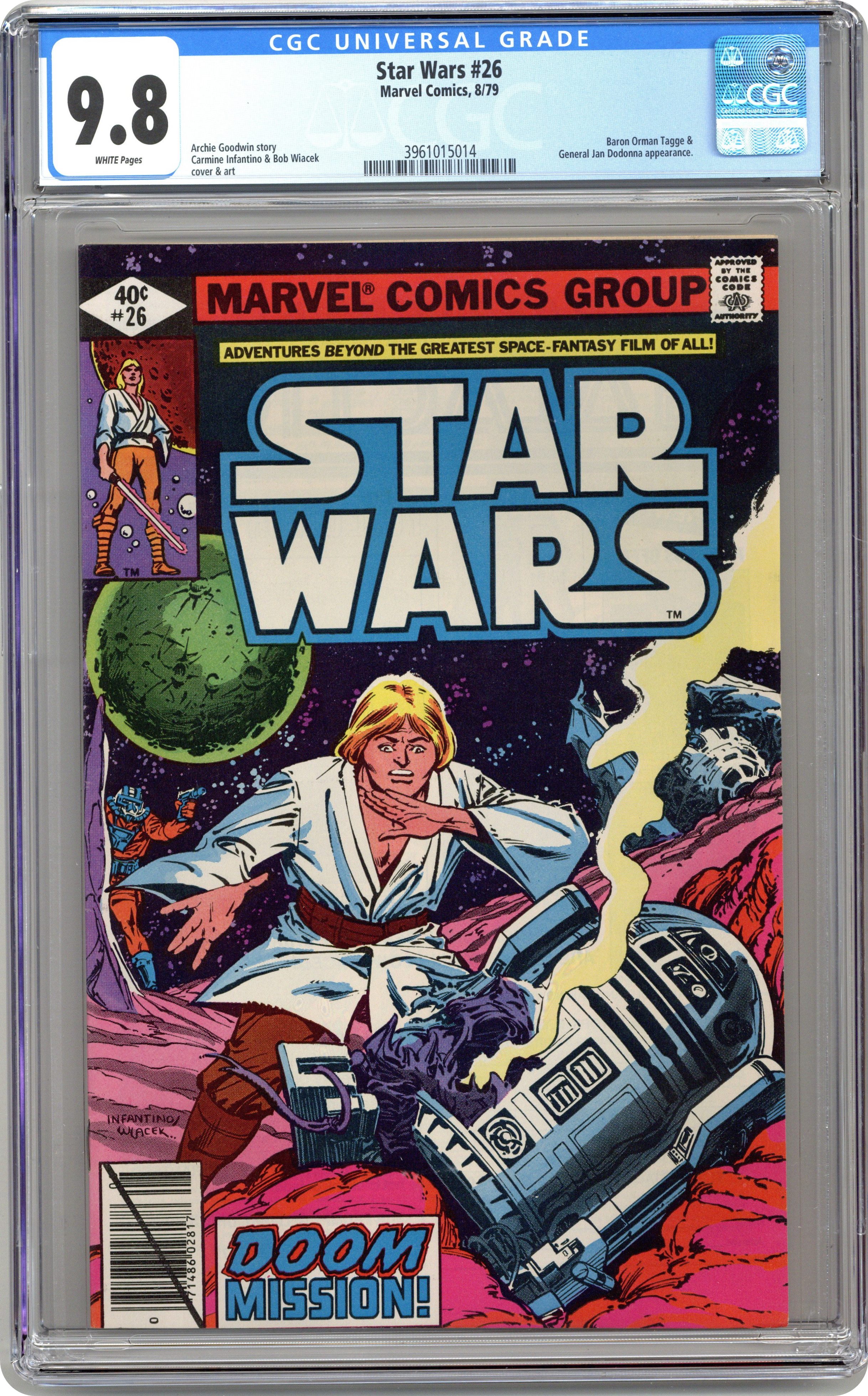 Direct Edition. "Doom Mission!" Written by Archie Goodwin. Art by Carmine Infantino and Bob Wiacek. When R2-D2 is gunned down, Luke contemplates his recent failures. Then the young hero sets out on another harrowing mission while piloting a captured enemy Tie-Fighter. Cover price $0.40. Grade: CGC 9.8 explanation of grade Condition: Used (collectible)