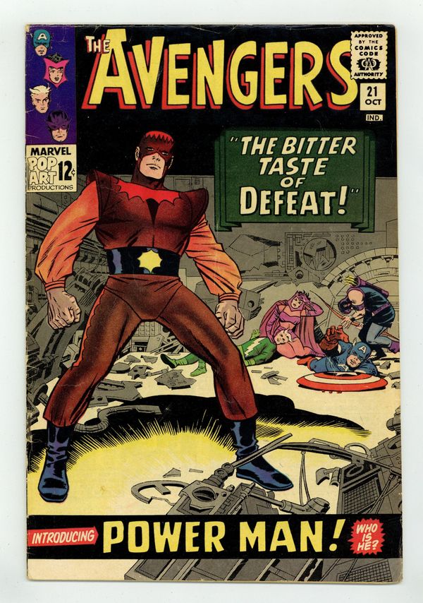 Cover pencils by Jack Kirby, inks by Wally Wood. "The Bitter Taste of Defeat!", script by Stan Lee, pencils by Don Heck, inks by Wally Wood; Enchantress uses the machine that Zemo used to create Wonder Man (see The Avengers #9) to turn one of Zemo's minions into Power Man; The two use tricks--and the Avengers' own internal discord--to make the Avengers appear dysfunctional; The City Council orders them to disband! Avengers Roll Call: Captain America, Hawkeye, Quicksilver, and the Scarlet Witch. Villains: the first Power Man (Erik Josten) and the Enchantress. Guest appearance by Tony Stark (Iron Man). Flashback cameos by the first Baron Zemo, the Executioner, and Wonder Man. Letter to the editor from comics writer Mike Friedrich. Reprinted in Marvel Triple Action #15. 36 pgs., full color. $0.12.
