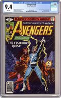 Direct Edition. "The Yesterday Quest!" Part 1 of 3. Plot by Mark Gruenwald and Steven Grant. Script by David Michelinie. Pencils by John Byrne. Inks by Dan Green. Cover by George Perez and Terry Austin. Ever since their first appearance in Uncanny X-Men 4 many years ago, the origin of Quicksilver and the Scarlet Witch has been a mystery to both comic readers and the siblings alike. After Wanda and Pietro arrive in Transia with Django Maximoff, clues to the twins' birthplace and birth parents begin to emerge. Modred the Mystic, the Darkhold, Bova the cow-woman, the High Evolutionary's former citadel, and Wundagore Mountain are all pieces to the puzzle. And the truth seems to lie at the top of the mountain. But there's something else at the top of Wundagore Mountain. Something ancient, something evil. Cameo appearance by Bova. Flashback cameos by Robert Frank, Madeline Frank, and the Toad. Avengers Lineup: Beast, Captain America, Falcon, Hawkeye, Iron Man, Jocasta, Ms. Marvel, Quicksilver, Scarlet Witch, Vision, and the Wasp. (Notes: Mark Gruenwald's participation in this three-part story was an indication of the storyline's importance to the continuity of the Marvel Universe. Modred previously appeared in Marvel Two-in-One 33. This issue includes a full-page ad for the Man-Thing's guest appearance in Micronauts 7.) 36 pages Cover price $0.40. Grade: CGC 9.4 explanation of grade Condition: Used (collectible)