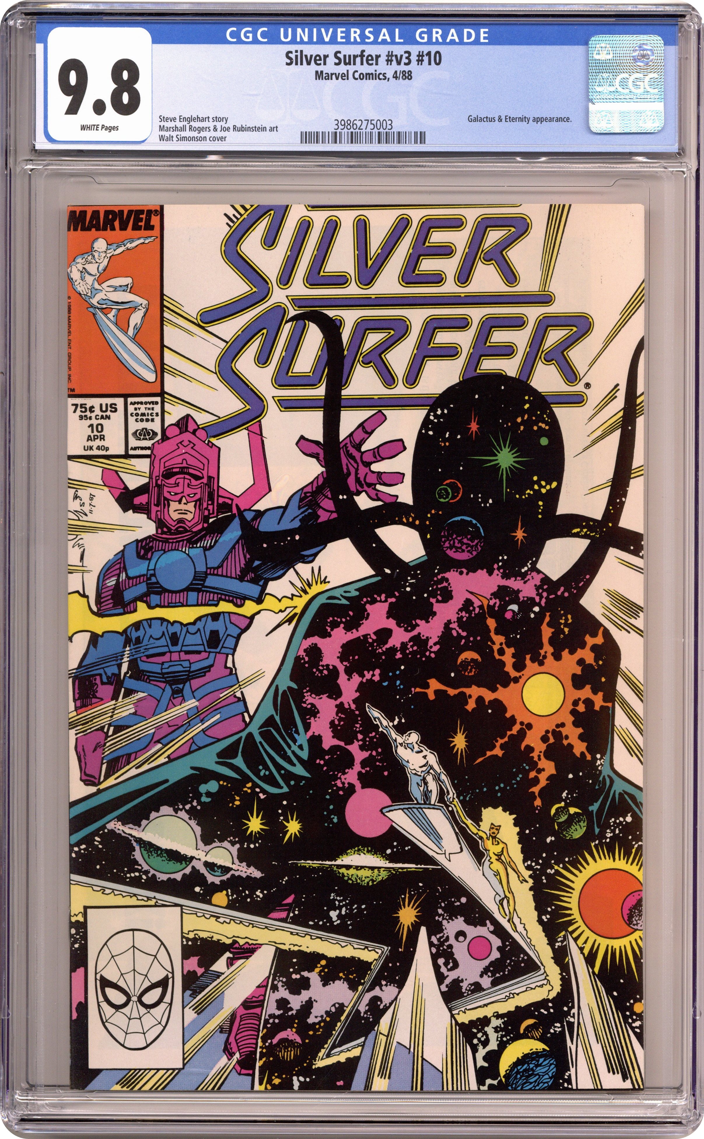 Space is...Eternity!" Guest-starring Galactus. Special guest appearance by Eternity. Fantastic Four cameo. Story by Steve Englehart. Art by Marshall Rogers and Joe Rubinstein. Cover by Walt Simonson. The Elders of the Universe dared to try and defeat Galactus and failed. Now, they must face the retribution of the Devourer of Worlds. 32 pages. Cover price $0.75. Grade: CGC 9.8 explanation of grade Condition: Used (collectible)