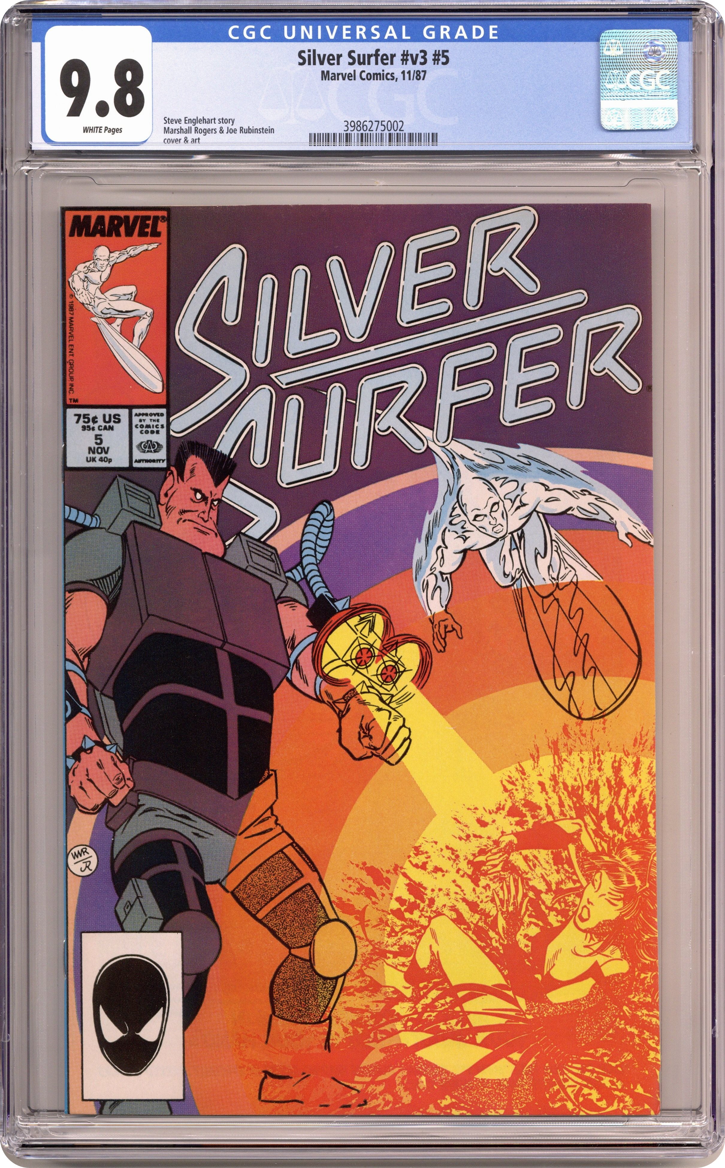 Direct Edition. "Obliteration!" Guest-starring Mantis. Story by Steve Englehart. Art by Marshall Rogers and Joe Rubinstein. The Elders of the Universe view the Silver Surfer and Mantis as a threat to their cosmic schemes and intend to eliminate them. Now, the Obliterator, an Elder over 5 billion years old and one who exterminated his entire race, has come seeking the death of the Surfer and his beautiful accomplice. 32 pages. Cover price $0.75. Grade: CGC 9.8 explanation of grade Condition: Used (collectible)