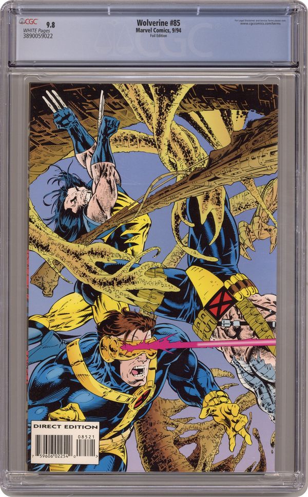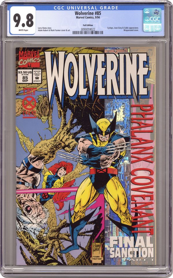 Holofoil Edition. Direct Edition. Giant-size issue. Collector's edition. HoloGraphic stripe on cover. Wraparound cover pencils by Adam Kubert, inks by Mark Farmer. The Phalanx Covenant: Final Sanction Part I Full Shred Thrash, script by Larry Hama, pencils by Adam Kubert, inks by Mark Farmer and Joe Rubinstein; Wolvie, Cable, Cyclops and Jean try to drive the invading Phalanx off of Muir Isle; Phalanx Covenant Cross-Over; Continued in Cable (1993 series) #16. 36 pgs. $3.50. Cover price $3.50. Grade: CGC 9.8 explanation of grade Condition: Used (collectible)