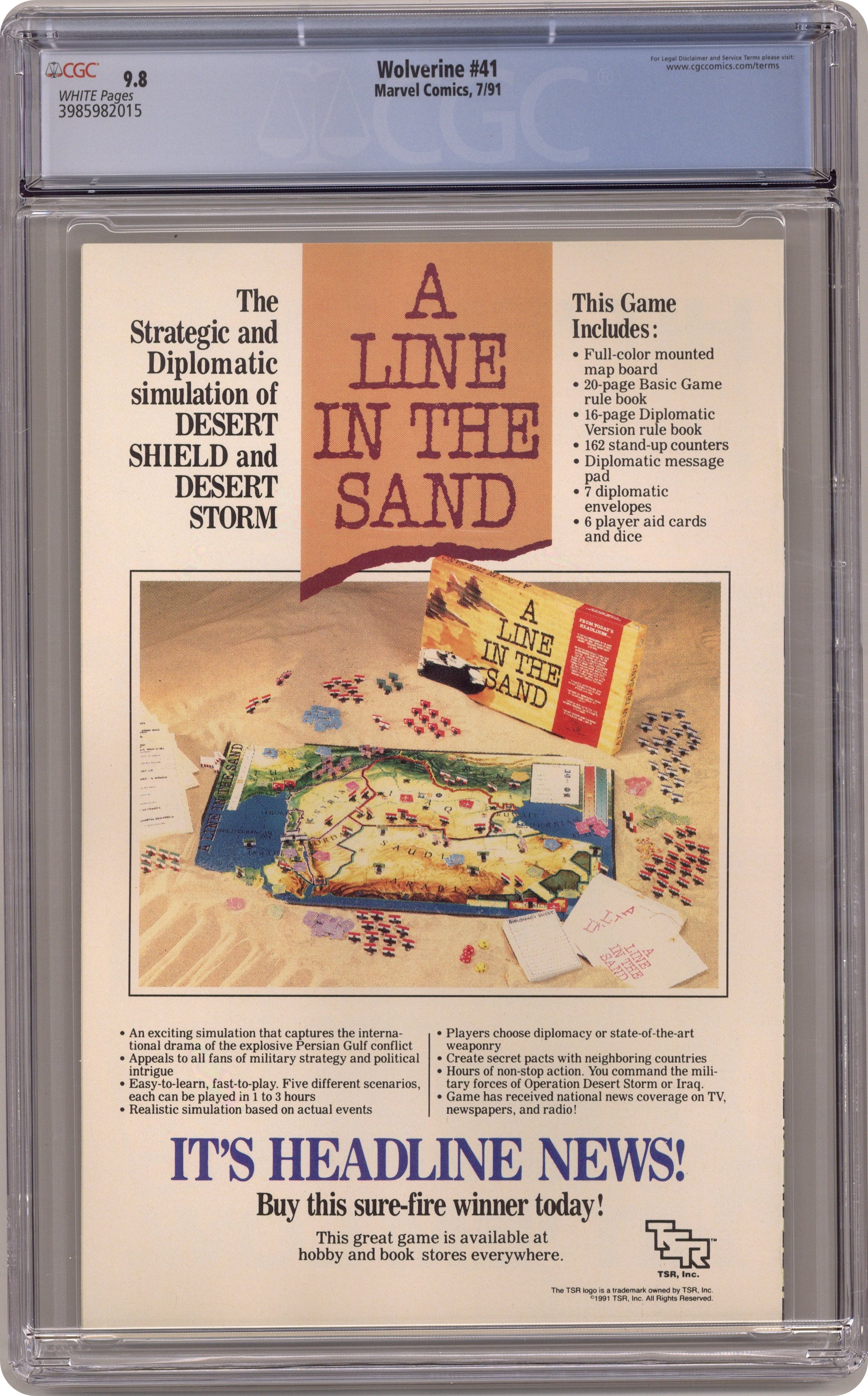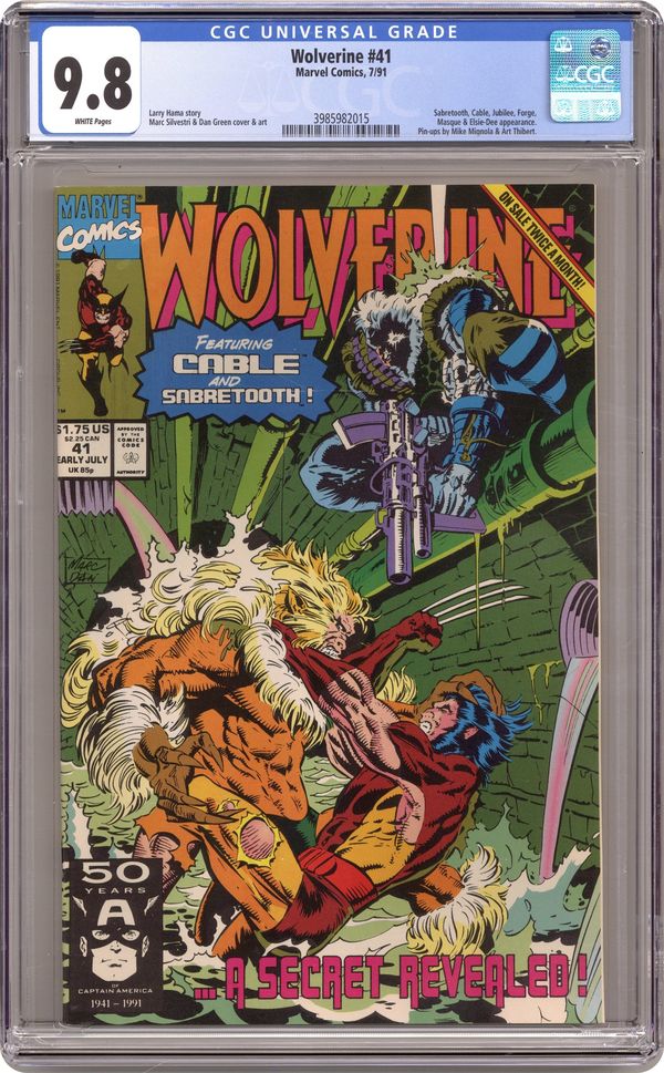 1st printing. Direct Edition. "Down in the Bottoms!" Guest-starring Cable, Jubilee, and Forge. Written by Larry Hama. Art by Marc Silvestri and Dan Green. Pin-ups by Mike Mignola and Art Thibert. Down in the Morlock Tunnels the mutant freedom fighter from the future Cable is hunting the most dangerous prey, but what he finds is Albert, the Wolverine replicant, and Elsie Dee, the little girl android. Meanwhile, Wolverine throws down with Sabretooth, but this time Logan's savage enemy drops a bombshell of a revelation too insane to be true. 32 pages, FC Cover price $1.75. Grade: CGC 9.8 explanation of grade Condition: Used (collectible)