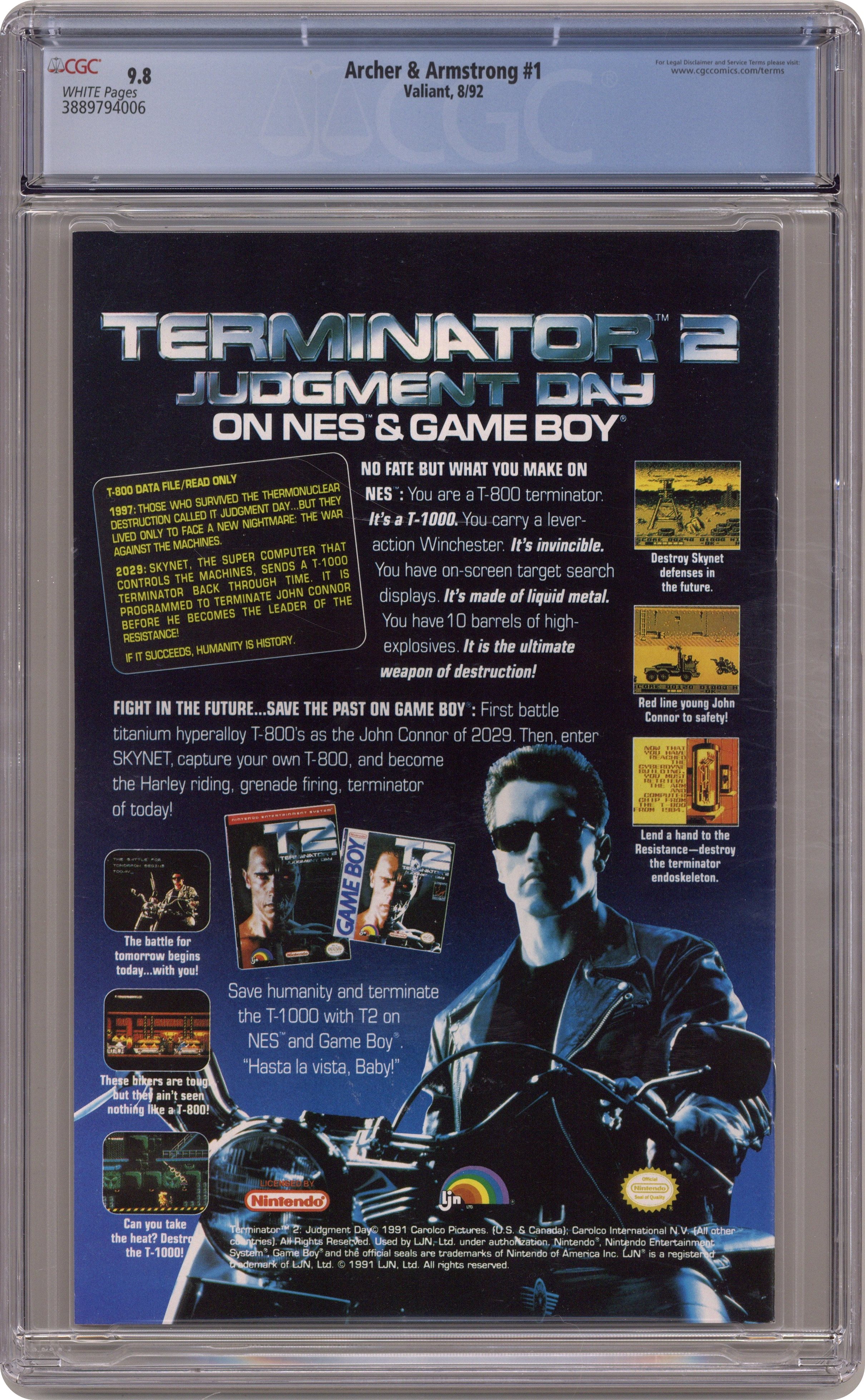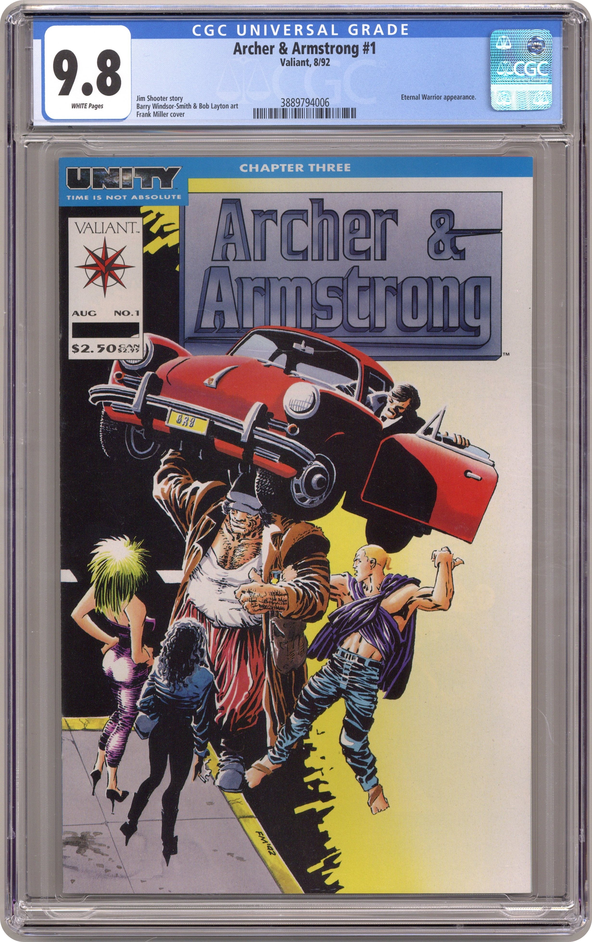 Cover by Frank Miller. Unity Chapter 3 "Up Against the Wall, Mother," script by Jim Shooter (co-plot, script), Barry Windsor-Smith (co-plot), and Bob Layton (co-plot), pencils by Barry Windsor-Smith, inks by Bob Layton; Archer and his peculiar partner are drafted by Armstrong's brother, the Eternal Warrior, to fight in war on the far side of time and space!; But who and what they find there offers ominous clues about what the future may hold for Archer & Armstrong and the final fate of the Valiant Universe; Characters: Albert; Archer; Armstrong [Aram Anni-Padda]; Erica Pierce; Eternal Warriors (of 1992 and of 4001); Geoff McHenry; the Harbinger kids [Flamingo; Kris; Sting; Zepplin]; Magnus; Mahmud; Rai [Tohru Nakadai]; Solar; X-O Manowar [Aric]. Continued from Eternal Warrior (Acclaim / Valiant, 1992 series) #1 and in Magnus Robot Fighter (Acclaim / Valiant, 1991 series) #15. 36 pgs., full color. Cover price $2.50. Grade: CGC 9.8 explanation of grade Condition: Used (collectible)