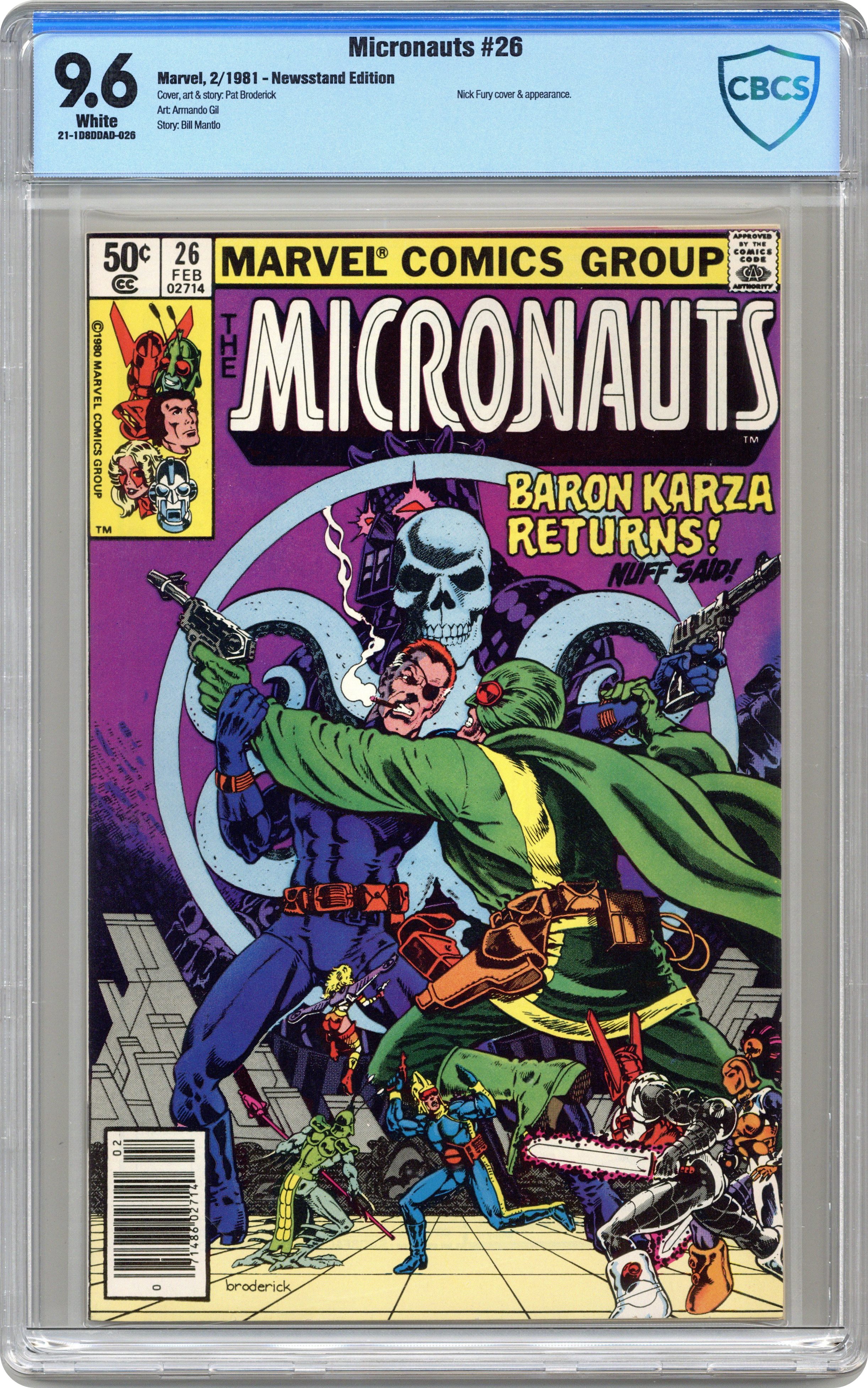 Baron Karza returns! 'Nuff said! "Assault on SHIELD" is written by Bill Mantlo and Pat Broderick, with art by Pat Broderick and Armando Gil. Nick Fury appearance. Plus: a "Tales of the Microverse" story by Bill Mantlo, Pat Broderick and Armando Gil. Cover by Pat Broderick. Cover price $0.50. Grade: CBCS 9.6 explanation of grade Condition: Used (collectible)