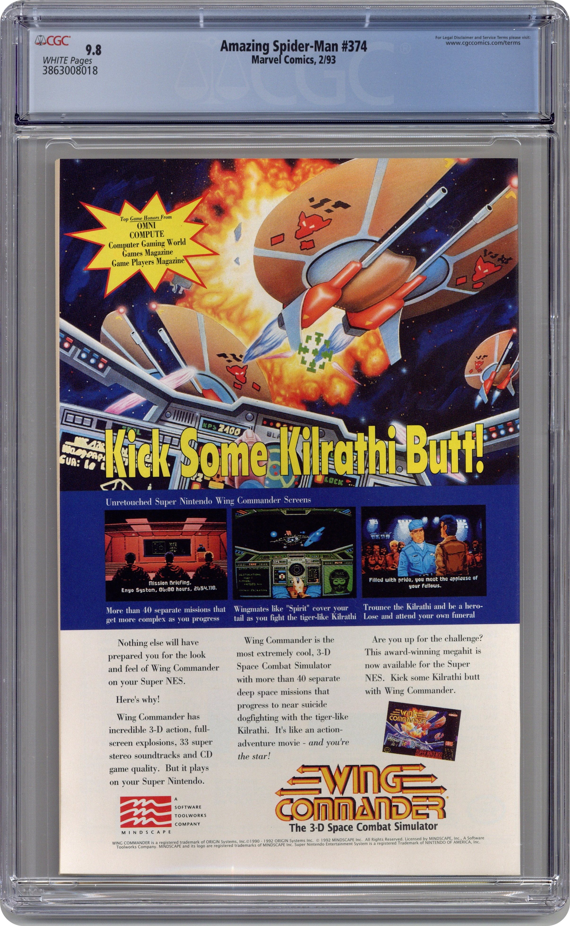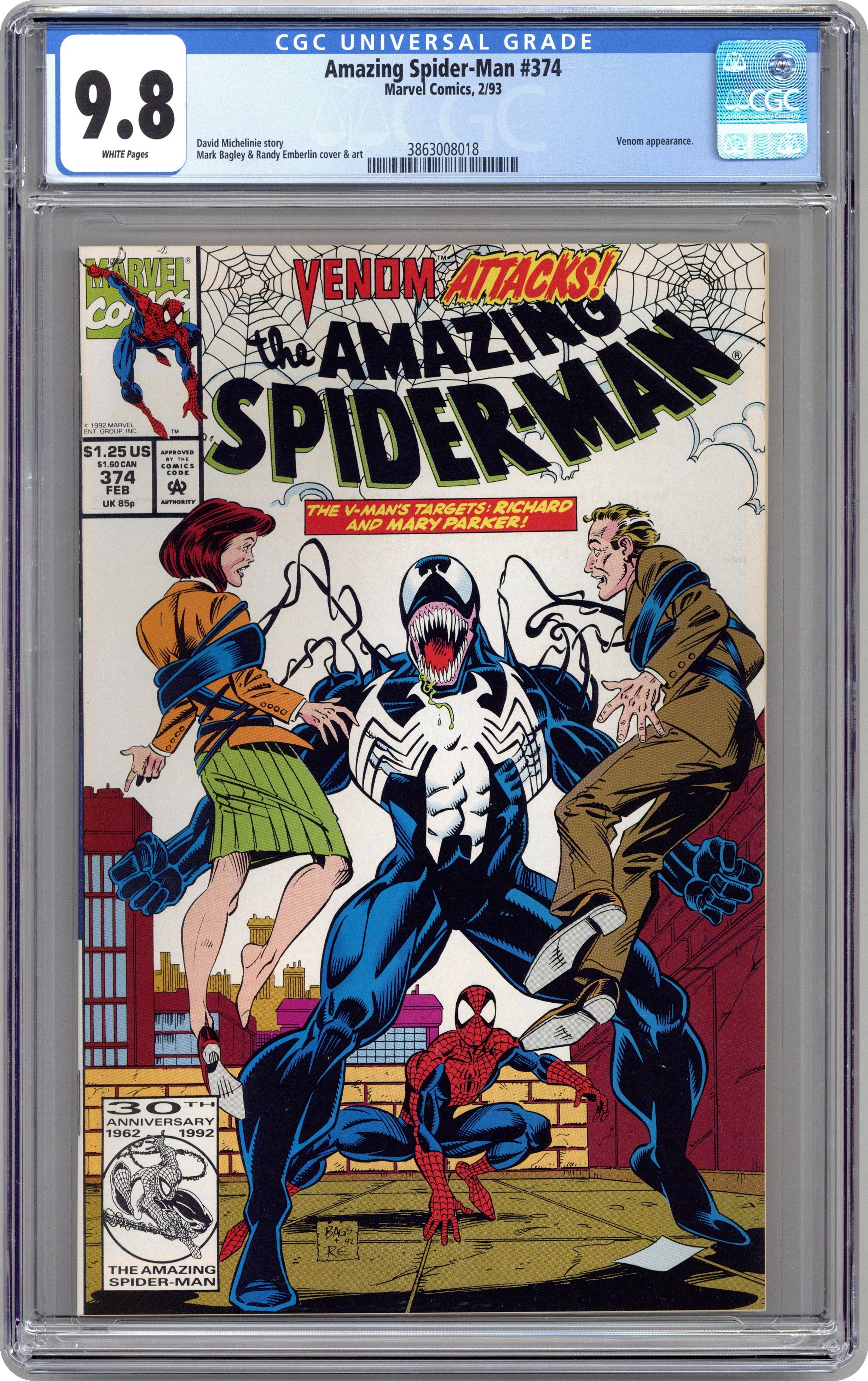 Direct Edition. "Murder on Parade" Part 1 of 2. Script by David Michelinie. Pencils by Mark Bagley. Inks by Randy Emberlin. Cover by Mark Bagley and Randy Emberlin. Several days ago, Richard and Mary Parker experienced the upside of having a son who is a superhero. But today they experience the downside...in spades! Venom believes that the Parkers need protection from their web-slinging son! So, the Lethal Protector tries to kidnap them! But the amazing one won't let that happen without a fight! And what a fight it is! Venom and the wall-crawler battle from block to block for the same goal: saving the Parkers! Truly a bizarre twist! Cameo appearances by Mary Jane Watson, Aunt May, Ben Urich, Joy Mercado, and J. Jonah Jameson. (Note: The letters page previews the cover to Amazing Spider-Man 375.) 36 pgs. Cover price $1.25. Grade: CGC 9.8 explanation of grade Condition: Used (collectible)