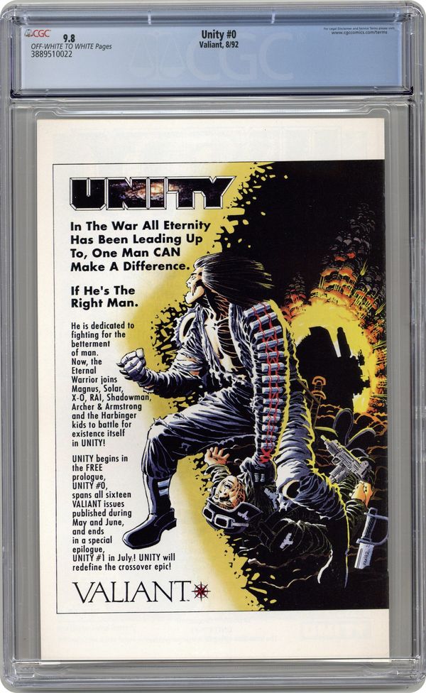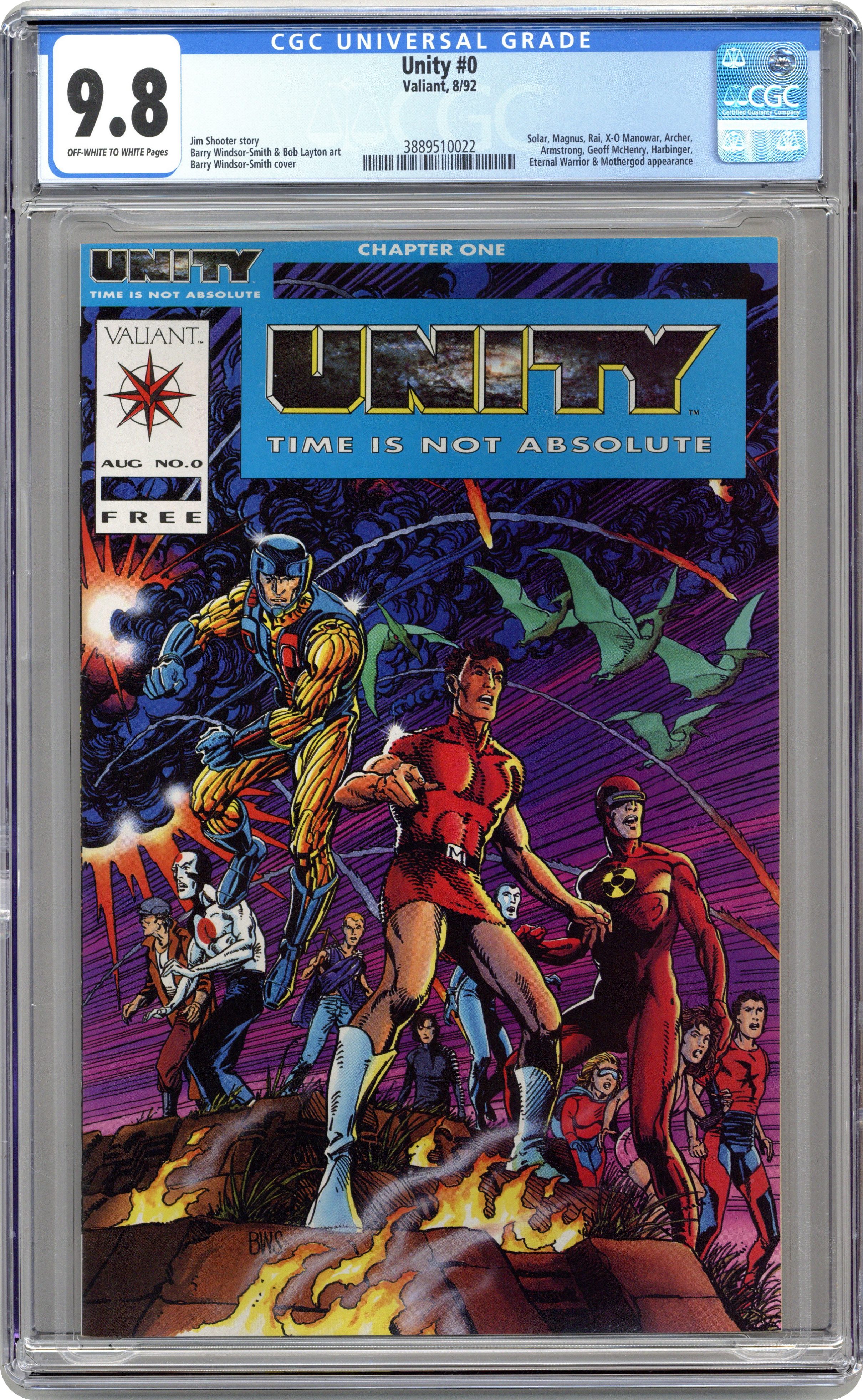 Regular Edition. Blue title logo. ValiantFan.com states this comic was Free with the purchase of 8 Unity comics. Barry Windsor-Smith/Bob Layton art. Grade: CGC 9.8 explanation of grade Condition: Used (collectible)