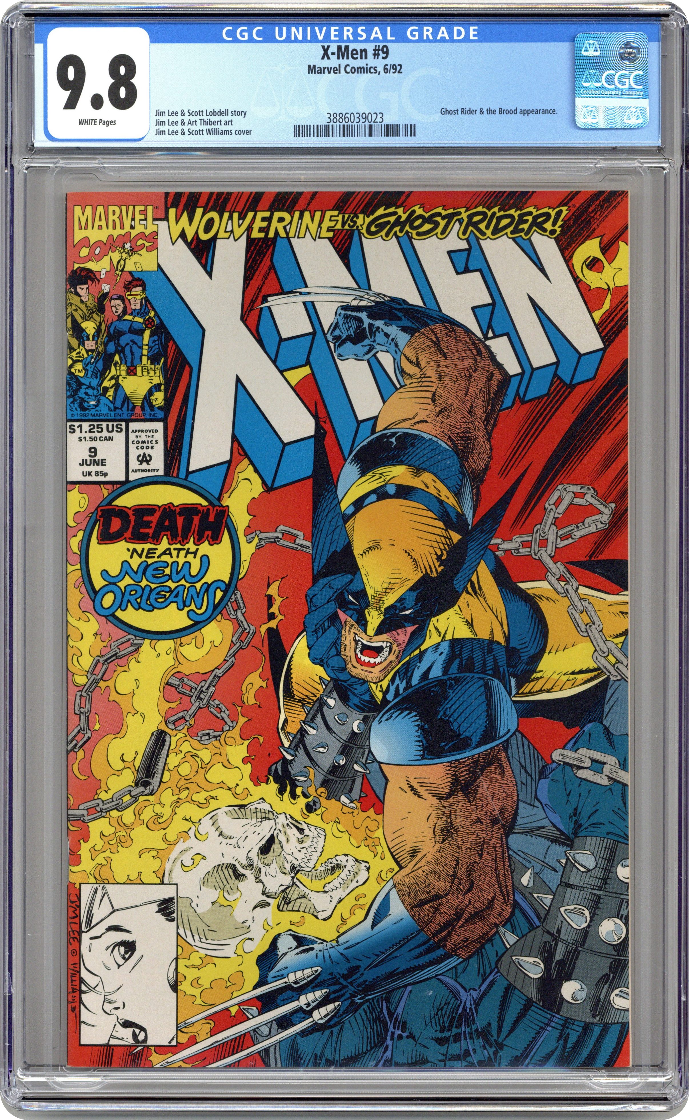 Cover pencils by Jim Lee, inks by Scott Williams. The Not So Big Easy, script by Jim Lee (Plot) and Scott Lobdell, pencils by Jim Lee, inks by Jim Lee and Art Thibert; The X-Men fight a Brood infected Ghost Rider beneath the streets of New Orleans and try to find a way to separate him from the alien menace; Cont. from Ghost Rider #26; Cont. in Ghost Rider #27. 36 pgs. $1.25. Cover price $1.25. Grade: CGC 9.8 explanation of grade Condition: Used (collectible)