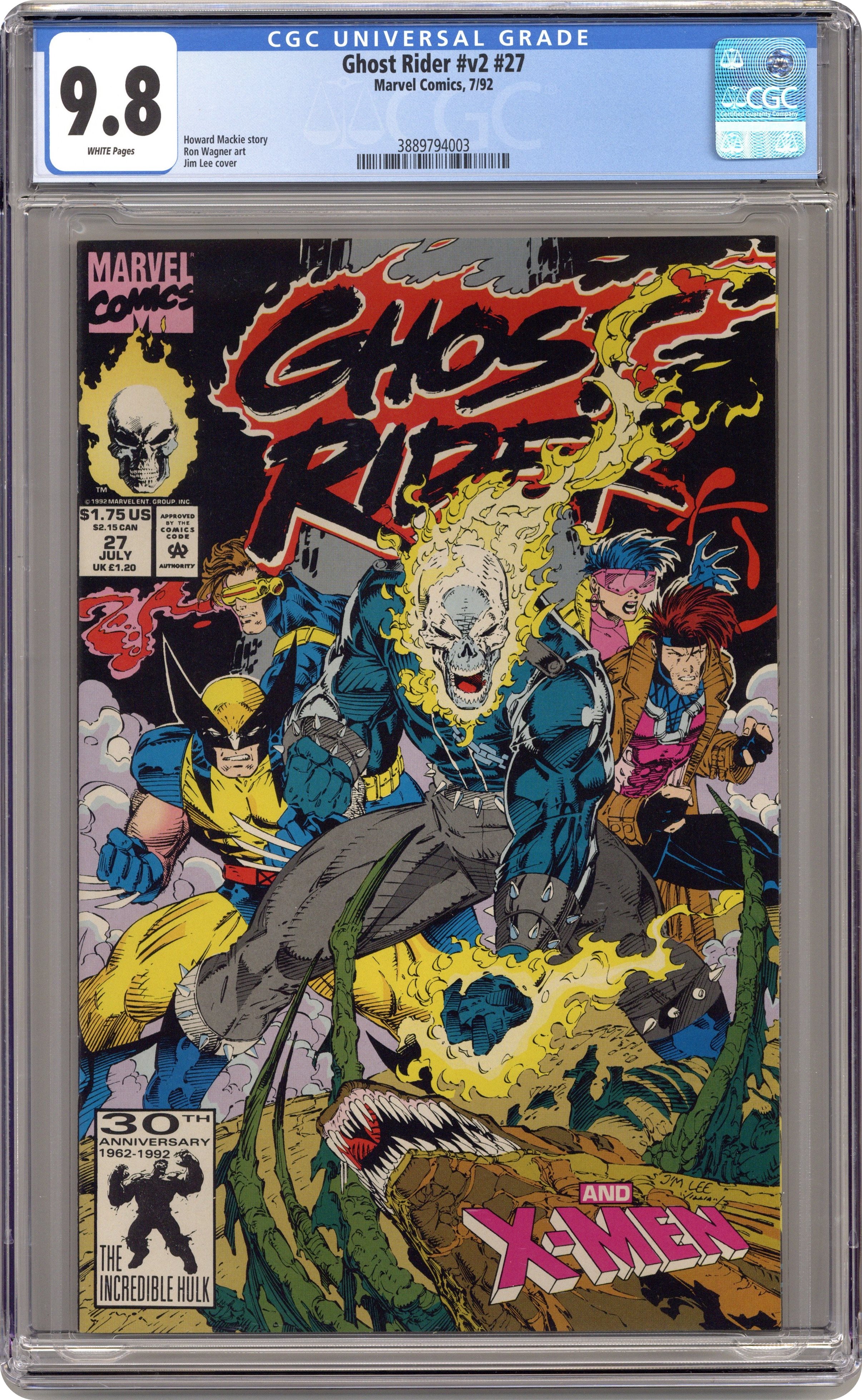 Ended Jan 22 2024 Winning Bid $45 Direct Edition. X-/Ghost Rider Crossover – Part 4 of 4 - "Vengeance. Pure and Simple!" Guest-starring the X-Men. Written by Howard Mackie. Art by Ron Wagner and Mike Witherby. Story continued from X-Men (1991 1st Series) #9. Ghost Rider in the X-Men search through the catacombs and find the Guild's children bound by the Brood. As the other X-Men free the children, Gambit, Wolverine, and Ghost Rider leave to hunt down the Brood Queen for her role in Bella Donna's death. Within the void, Dan's spirit recovers from Ghost Rider's possession by the Brood. Outside the city, Clara Menninger notifies Johnny Blaze of Ghost Rider's presence in New Orleans. Blaze tells Clara to inform his wife that he will catch up at their next stop in Providence, Rhode Island, then rides off. The black garb assassin and more Brood drones soon surround Ghost Rider, Gambit, and Wolverine, and even more drones attack the other X-Men. Ghost Rider's group dispatches their foes, but they are prevented from chasing the assassin by the arriving Brood Queen. The Queen speeds back to where the children were held, but Ghost Rider leashes her with his chain and tows her above ground. The Brood Queen is destroyed by the combined efforts of Ghost Rider, the X-Men, and the arriving Blaze. Gambit swears a debt of honor to Ghost Rider before he and Blaze ride off, but the assassin, watching overhead, swears vengeance on them all. 32 pages, FC. Cover price $1.75. Grade: CGC 9.8 explanation of grade Condition: Used (collectible)