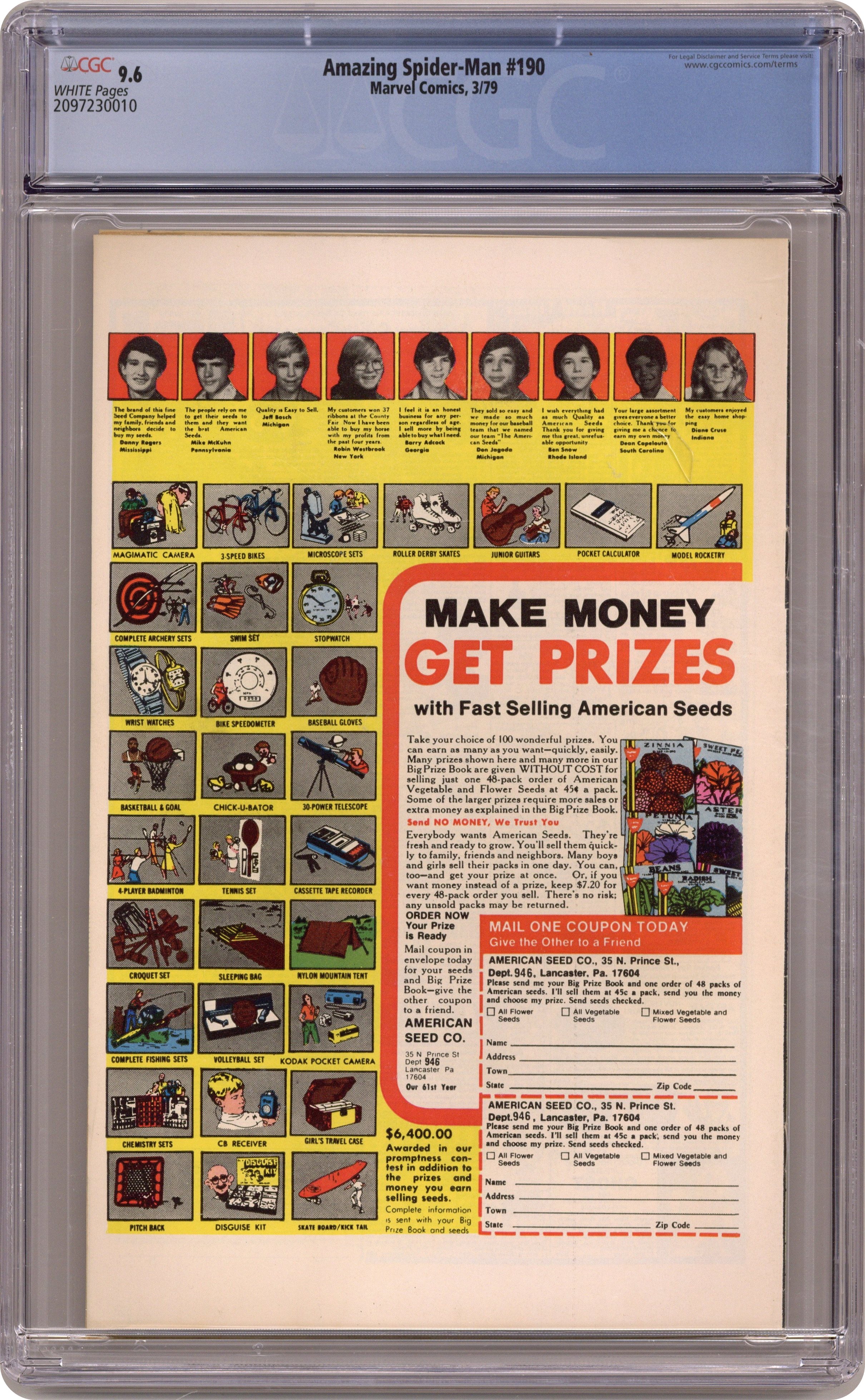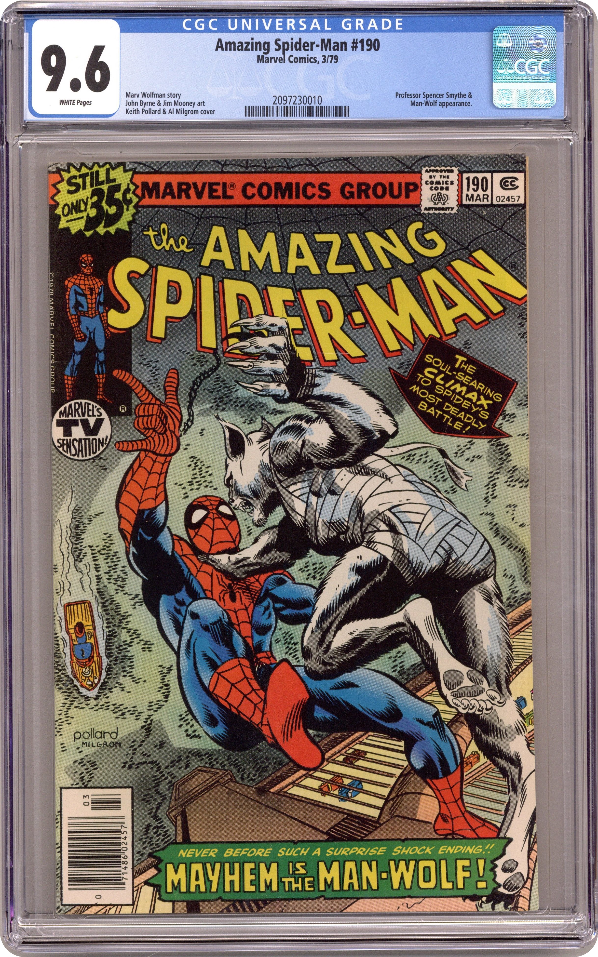 "In Search of the Man-Wolf!" Part 2 of 2. Script by Marv Wolfman. Art by John Byrne (layouts) and Jim Mooney (finishes). Cover by Keith Pollard and Al Milgrom. In incredible fashion the Man-Wolf (aka John Jameson) has reappeared in Manhattan and snatched his father! And now the wondrous wall-crawler chases the lupine beast across the city to rescue Jonah! As Spider-Man and the Man-Wolf battle towards the East River, Professor Spence Smythe revels in his victory! The amazing one finally corners the Man-Wolf atop the Brooklyn Bridge! It's a place the web-slinger knows all too well. With John Jameson's life hanging in the balance, can the Amazing Spider-Man prevent history from repeating itself? A powerful two-part story. (Notes: The plot briefly crosses over with the story in Fantastic Four 204. The Man-Wolf returns in Savage She-Hulk 13 & 14; and battles the web-slinger again in Spectacular Spider-Man Annual 3.) 36 pages Cover price $0.35. Grade: CGC 9.6 explanation of grade Condition: Used (collectible)