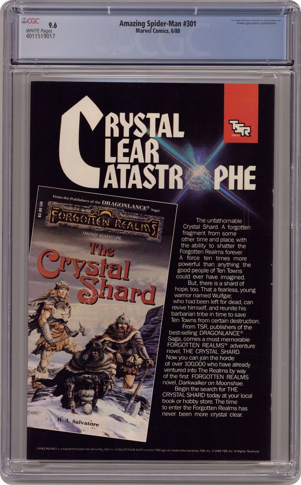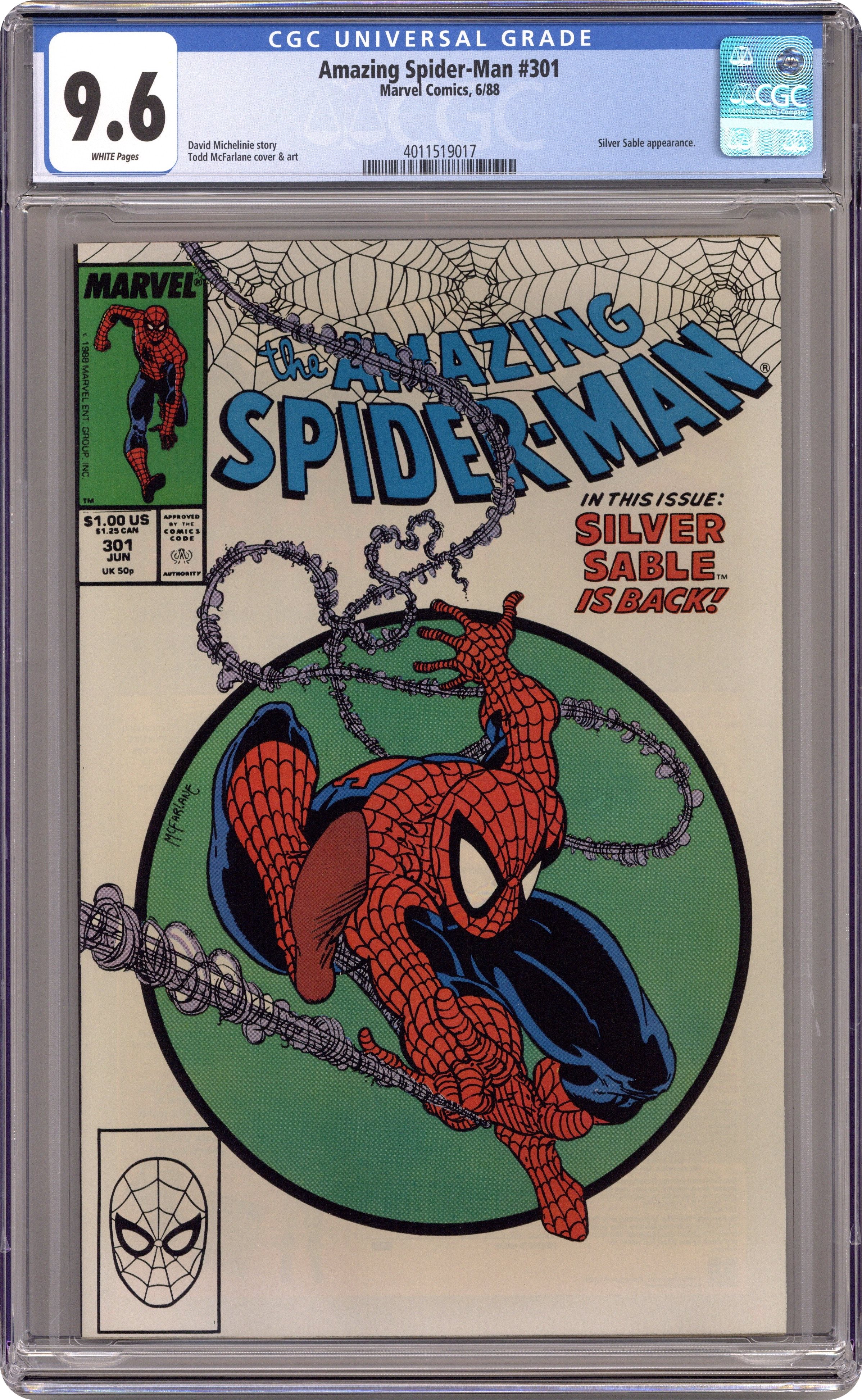 Direct Edition. "The Sable Gauntlet!" Guest-starring Silver Sable. Script by David Michelinie. Art by Todd McFarlane. Cover by Todd McFarlane. The first 300 issues of the Amazing Spider-Man are in the books after the web-slinger's epic battle vs. Venom last issue! And now the next chapter in the wall-crawler's anthology begins with an encounter with his favorite mercenary: Silver Sable! The enchanting sable agrees to make a test run through the security systems of a new high-rise office building, but deadly danger awaits on the top floor! Will Spidey catch the elevator in time? Cameo appearances by Mary Jane Watson and Dr. Morris Sloan. First $1.00 issue. (Notes: The cover is the same artwork (with different colors) as the cover to issue 300. This issue includes a full-page ad for the first appearance of Typhoid Mary in the Daredevil (1st) series -- art by John Romita Jr. and Al Williamson. The letters page contains a statement of ownership: average print run 469,913; average paid circulation 284,692. 36 pgs. Cover price $1.00. Grade: CGC 9.6 explanation of grade Condition: Used (collectible)